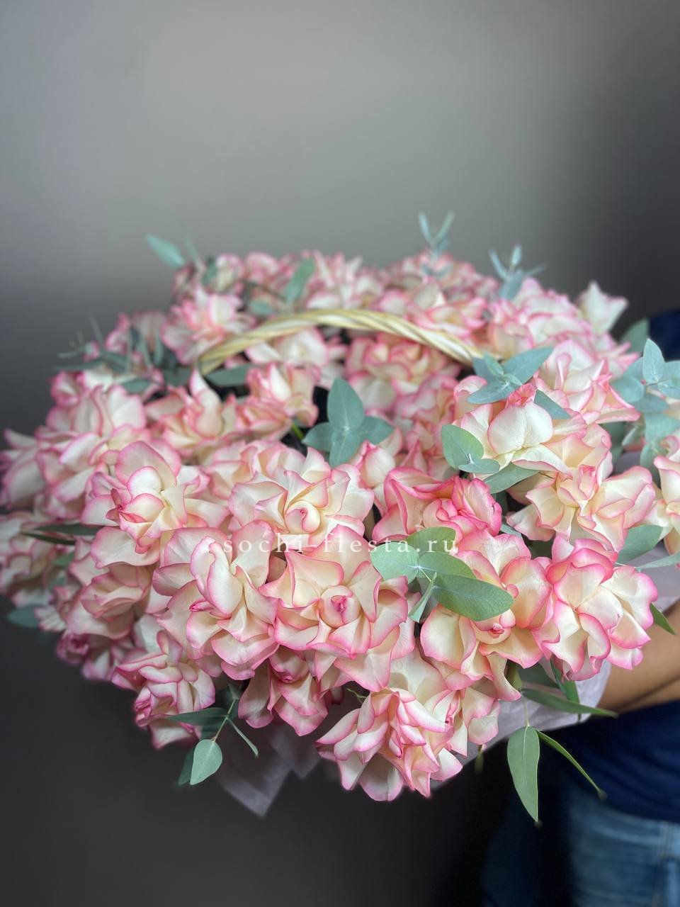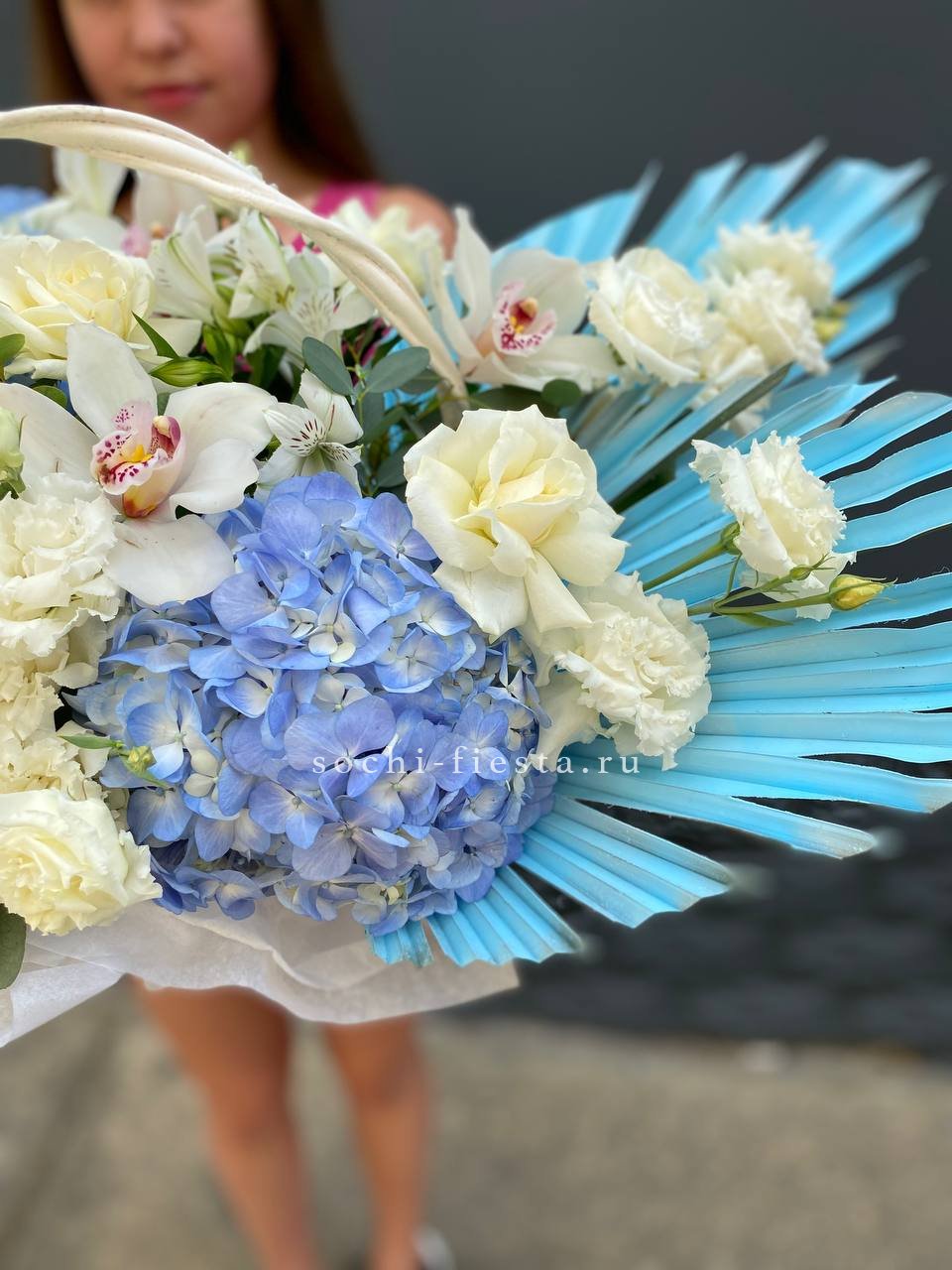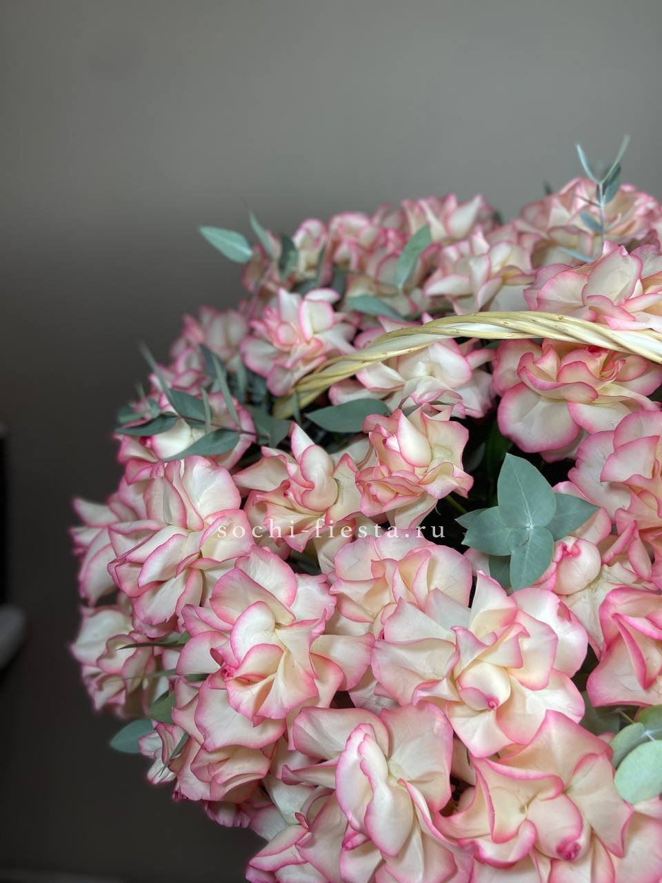 Корзина объединяет гортензии, эустомы, розы и маттиолу в многослойную композицию. Разные фактуры лепестков создают визуальную глубину и насыщенность.