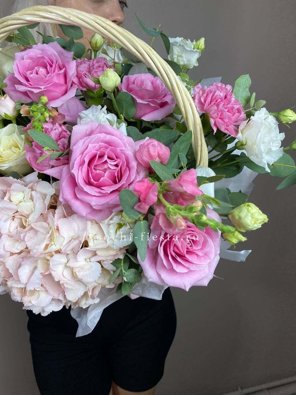 Пышная корзина с розами и гортензией раскрывается мягкими переходами розовых тонов. Эустома и диантус добавляют воздушности, а эвкалипт создает свежую основу для многослойной композиции. Авторская работа для важных событий и значимых встреч.