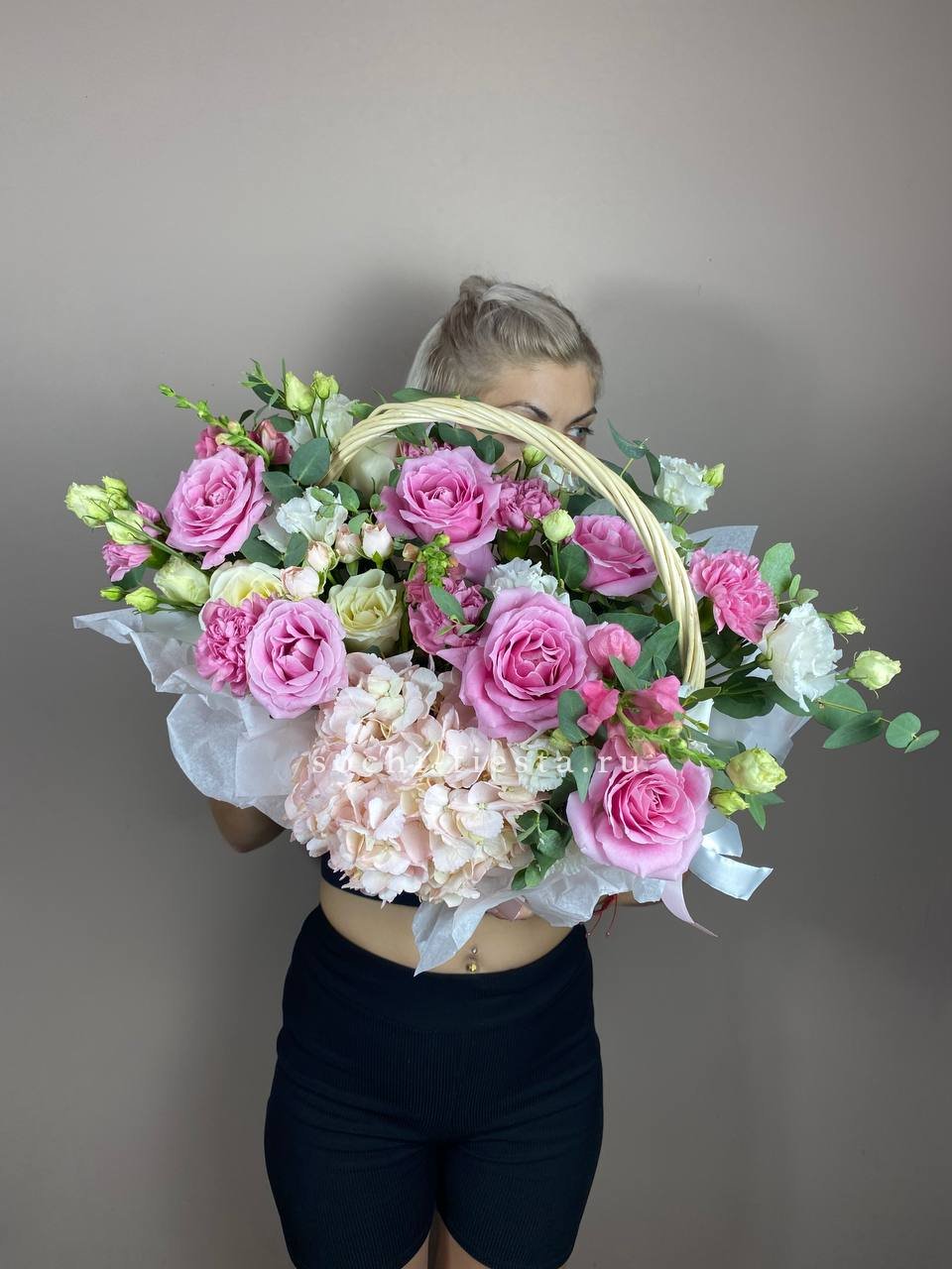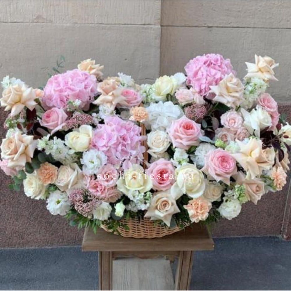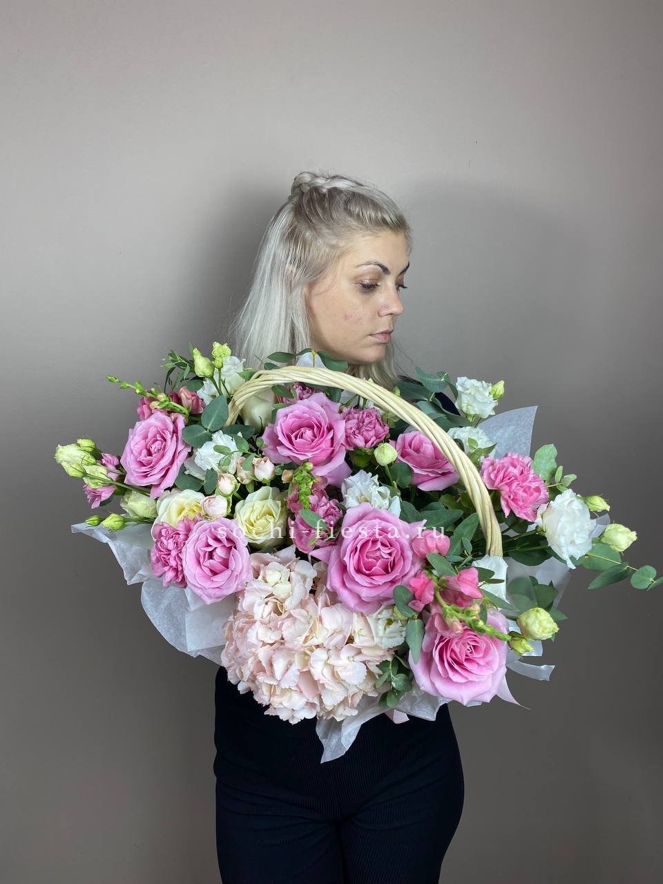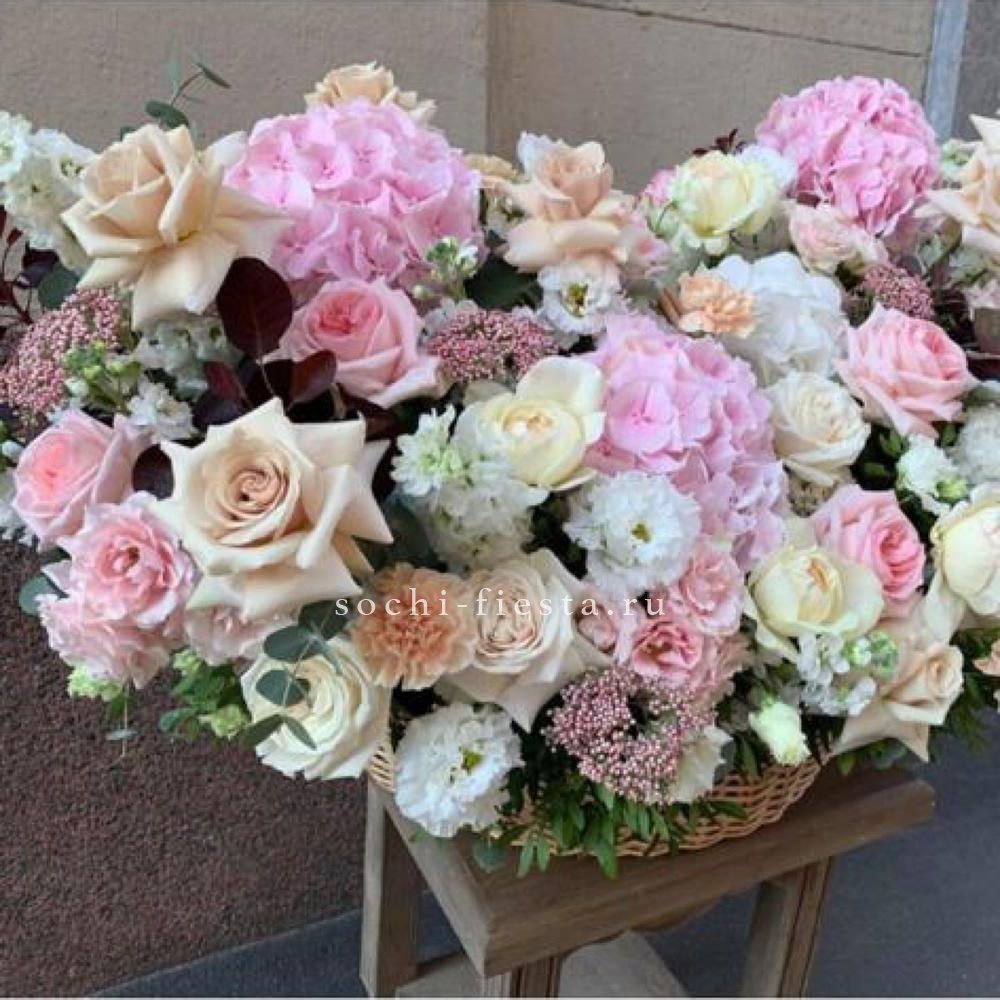 орхидея, гортензия, эустома, роза, эвкалипт, альстромерия, лента, корзина.
