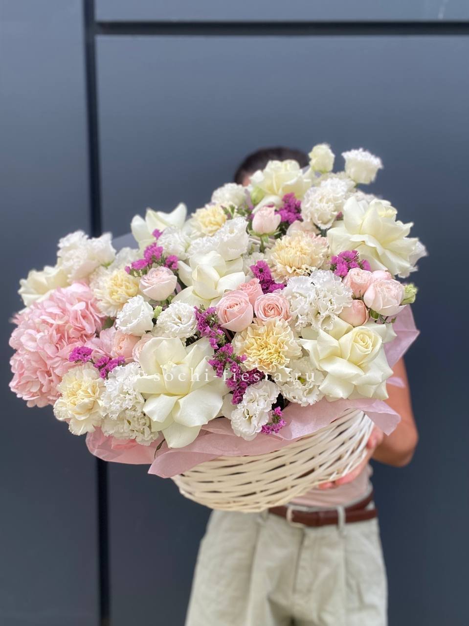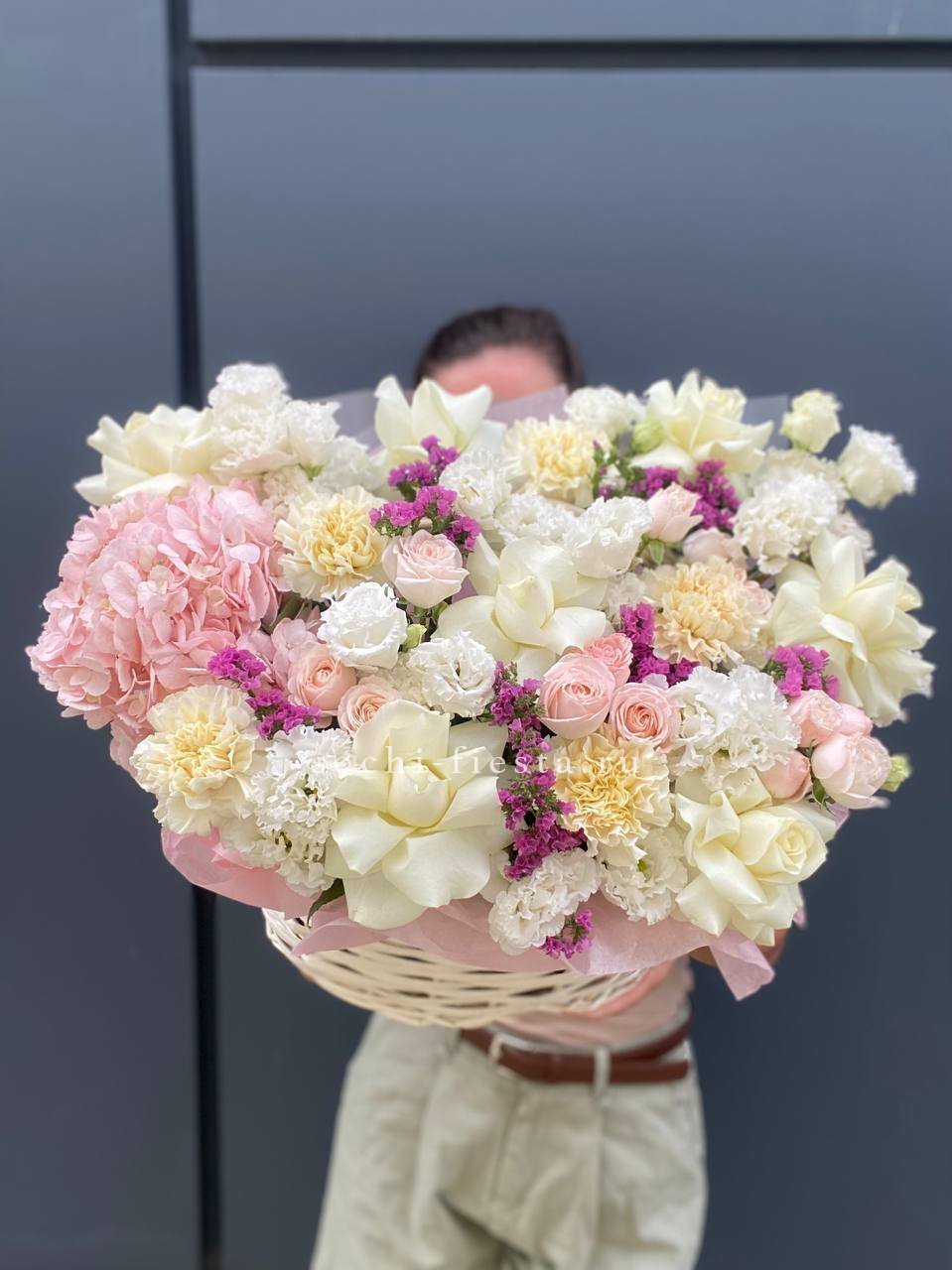Пышные шапки гортензии и яркие бомбастики собраны в корзину с плавными переходами оттенков. Композиция держит форму и создаёт объёмное цветовое пятно в любом пространстве.