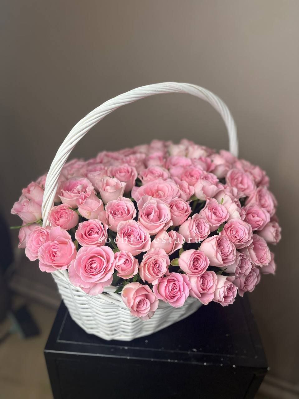 Пышная композиция в плетеной корзине объединяет розы, гортензию, эустому и дельфиниум в единую объемную форму. Маттиола и бомбастик добавляют воздушности, а эвкалипт создает мягкий природный фон. Корзина удобно располагается на любой поверхности и держит форму без дополнительной опоры.