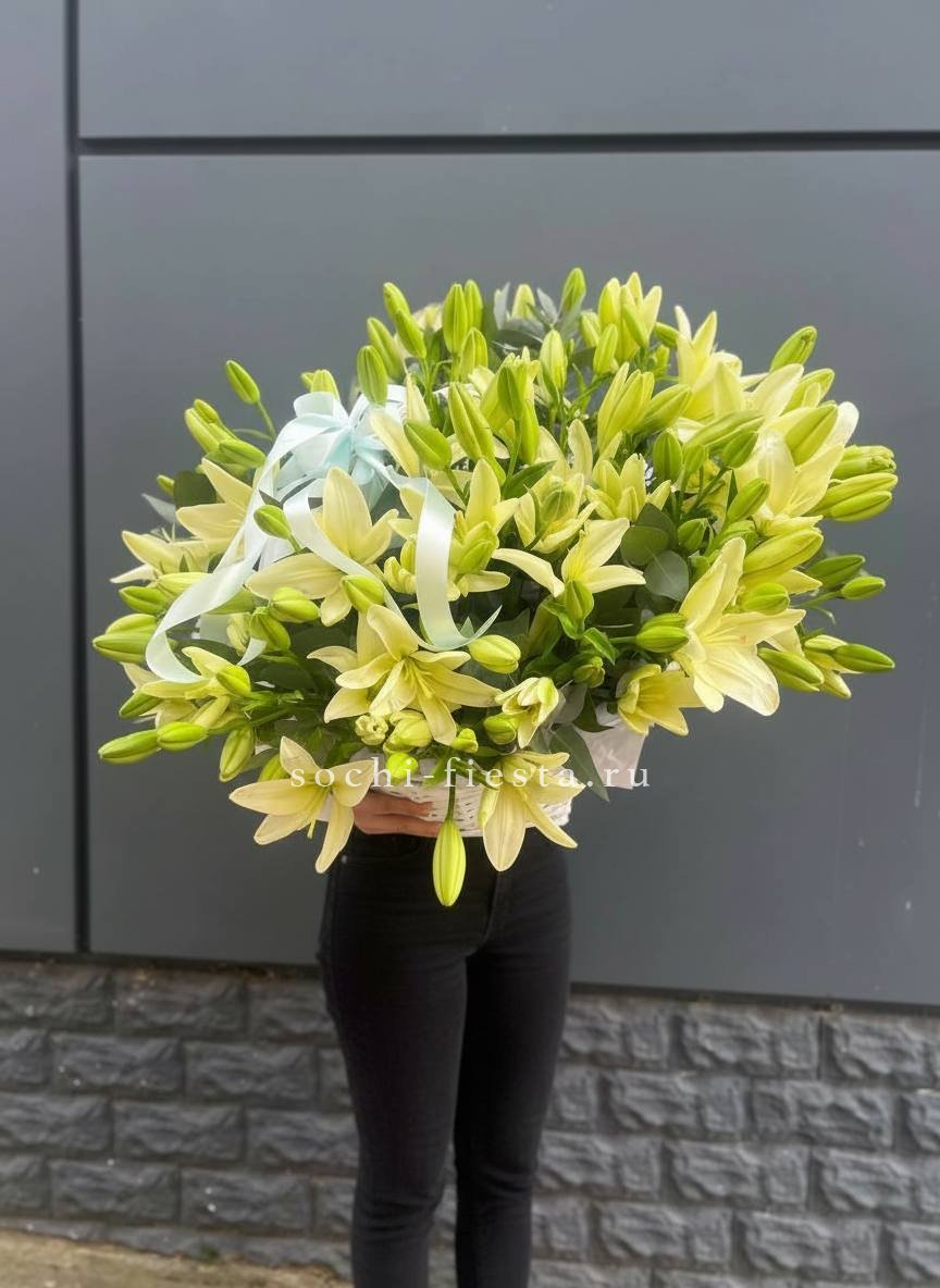 лилии в корзине с эвкалиптом На фото 23 шт.