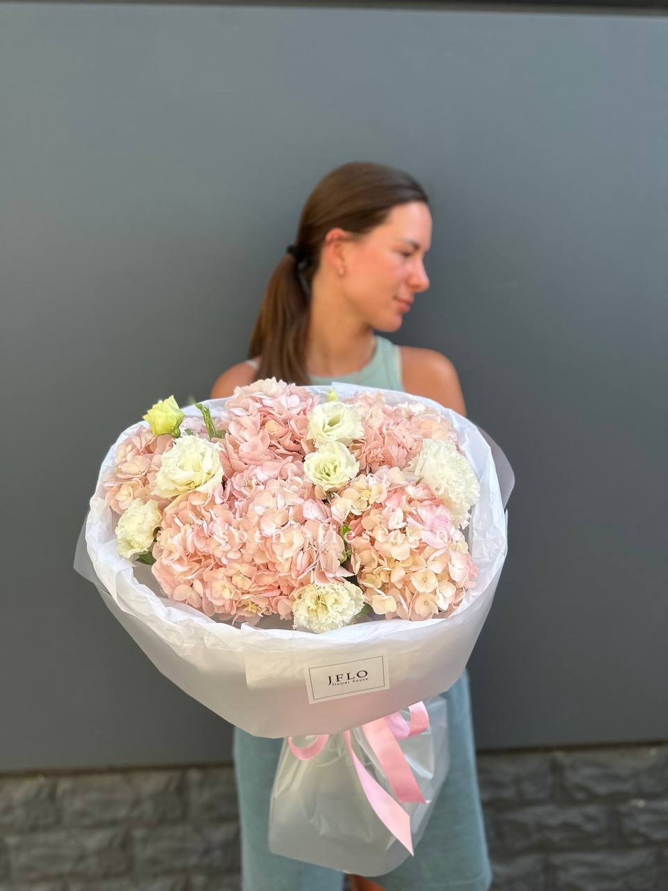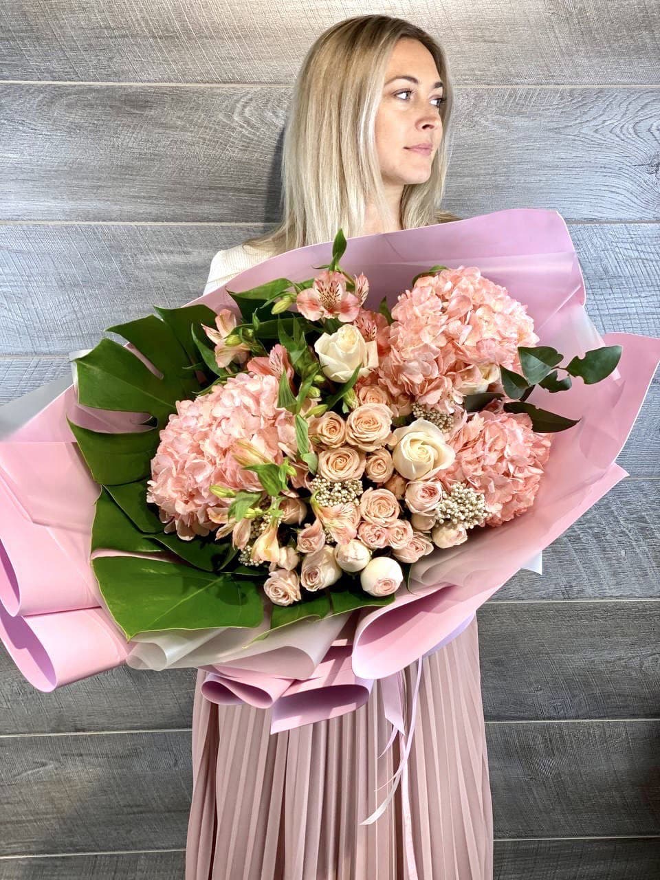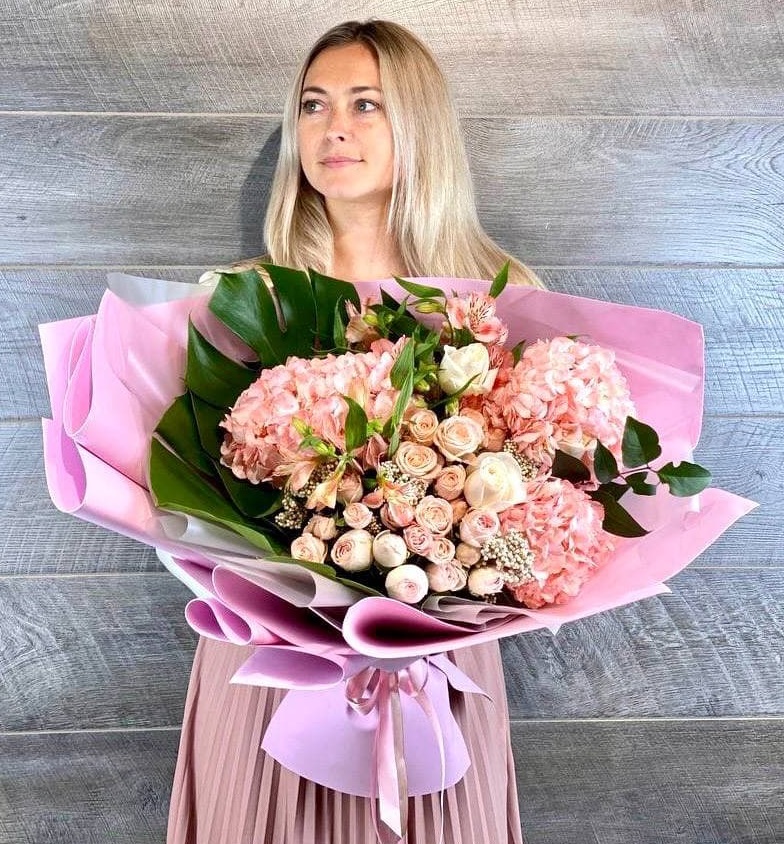 розы, диантусы, пионовидные кустовые розы, гортензия, эвкалипт, вспомогательная зелень, лента, дизайнерская упаковка.