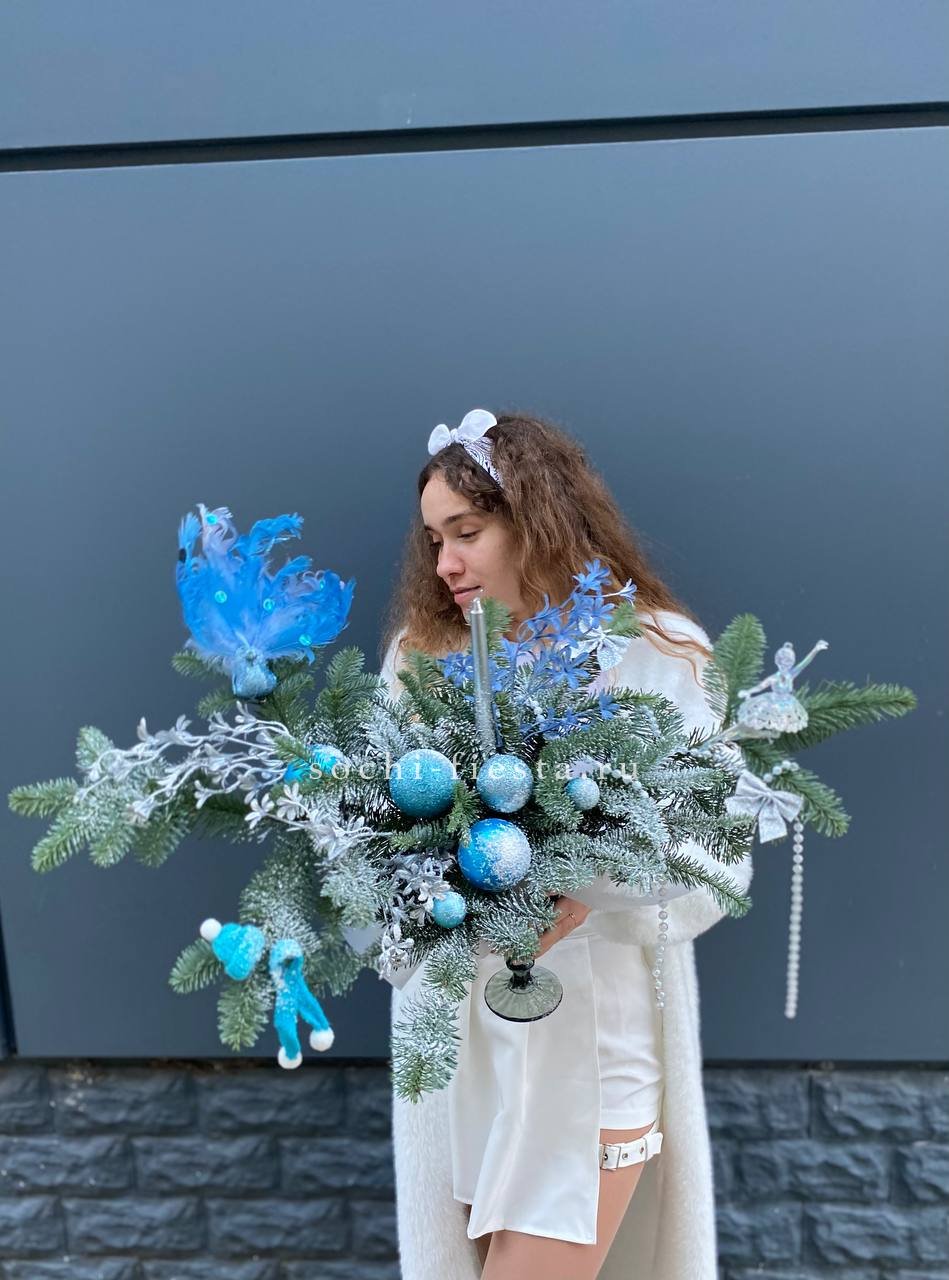 Голубые оттенки декора в сочетании с зеленью нобилиса раскрывают морозную палитру зимы. Свеча в прозрачном бокале добавляет лёгкости и света небольшой настольной форме.