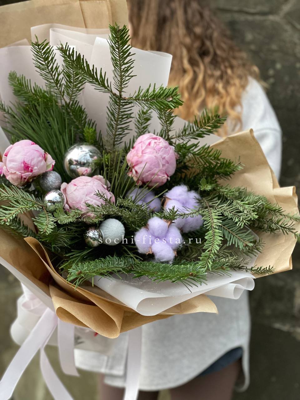 Три пиона среди датского нобилиса создают неожиданное сочетание зимней свежести и летней памяти. Хлопок и украшения завершают композицию, которая дарит ощущение праздника вне сезона.