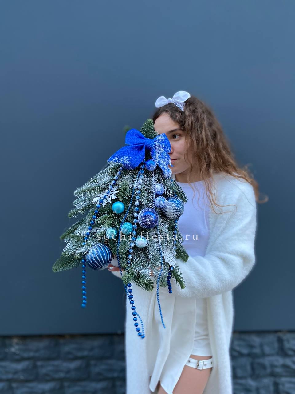 Пушистые ветви датского нобилиса собраны в плотную форму конуса и украшены россыпью бус с праздничными игрушками. Композиция держит силуэт и наполняет комнату свежим хвойным ароматом.