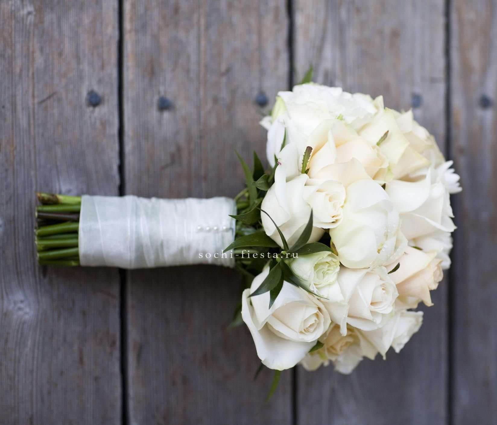 Двадцать один белоснежный диантус собран в округлую форму классического свадебного букета. Плотная структура и чистота линий подходят для церемонии.