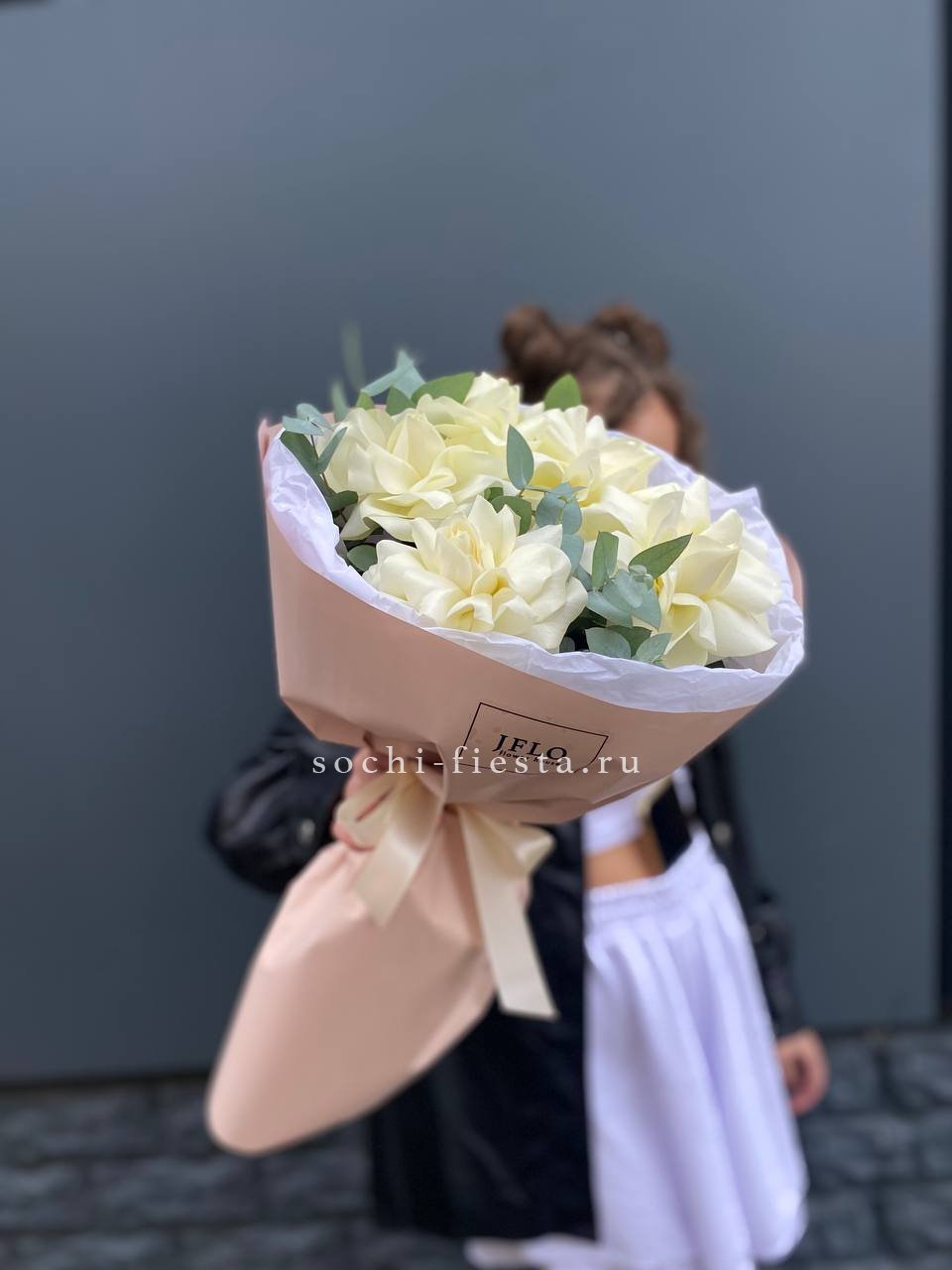 Белоснежные лепестки создают ощущение света и простора. Двадцать один бутон образует воздушную композицию с мягким переходом оттенков. Букет дарит момент тишины и покоя.