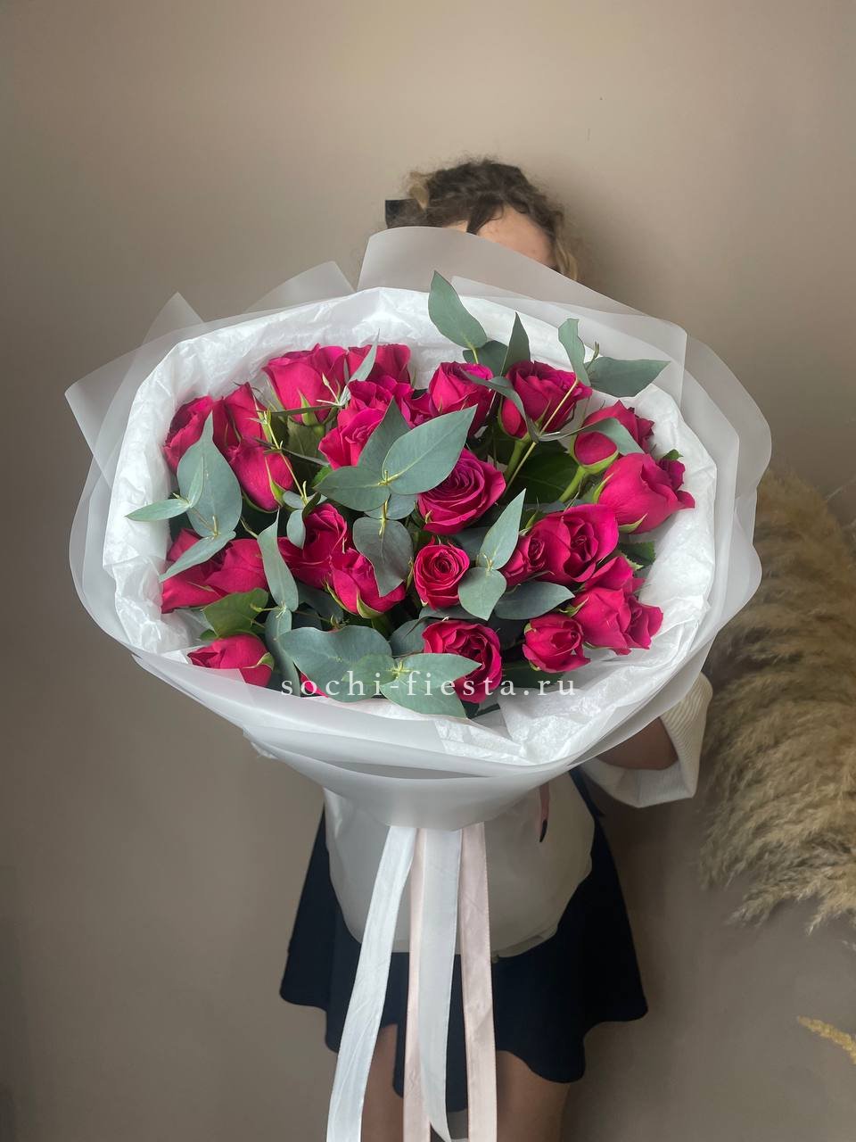 Двадцать пять малиновых бутонов собраны в плотную форму и дополнены серебристыми ветками эвкалипта. Яркий оттенок лепестков создает живое впечатление и заряжает энергией.