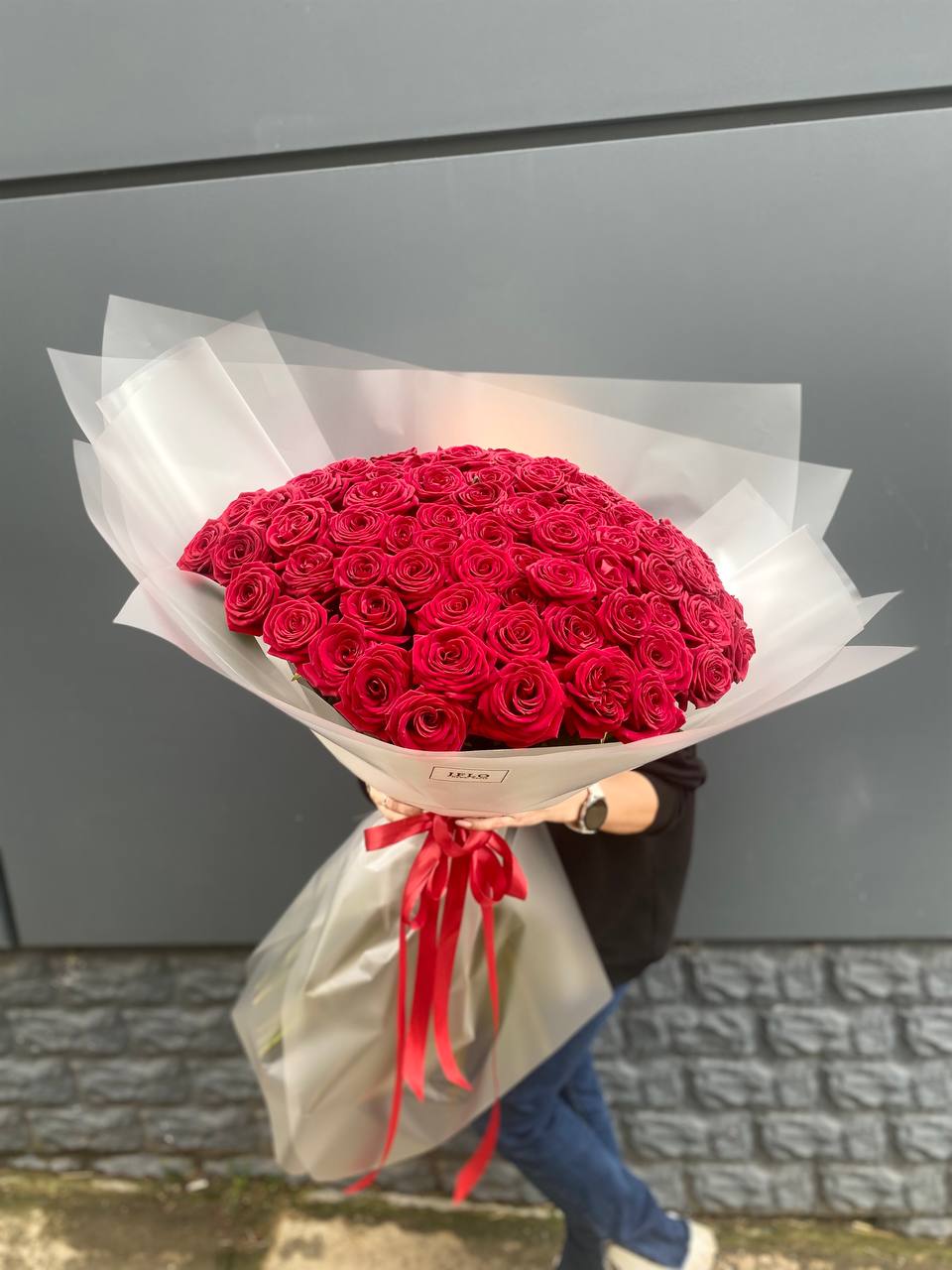Одиннадцать голландских роз с бархатными красными лепестками уложены в плёнку с лентой. Классическая подача и выразительный цвет создают запоминающееся впечатление.