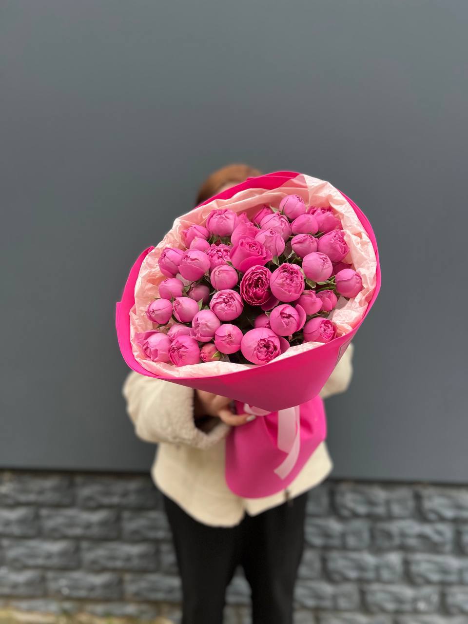 Минимальный состав: 35 пионовидных кустовых роз Мисти бабблс, лента, авторское оформление.