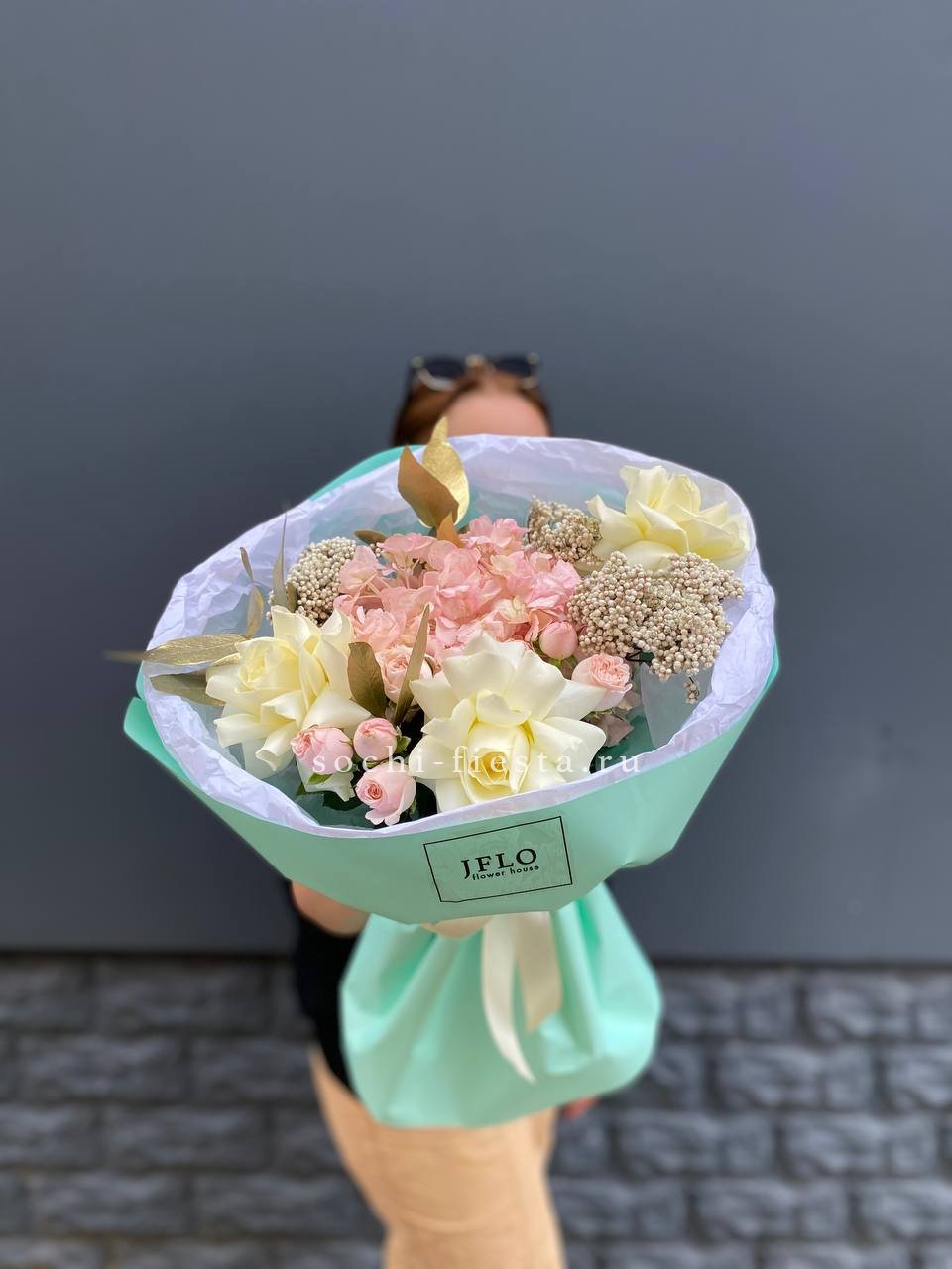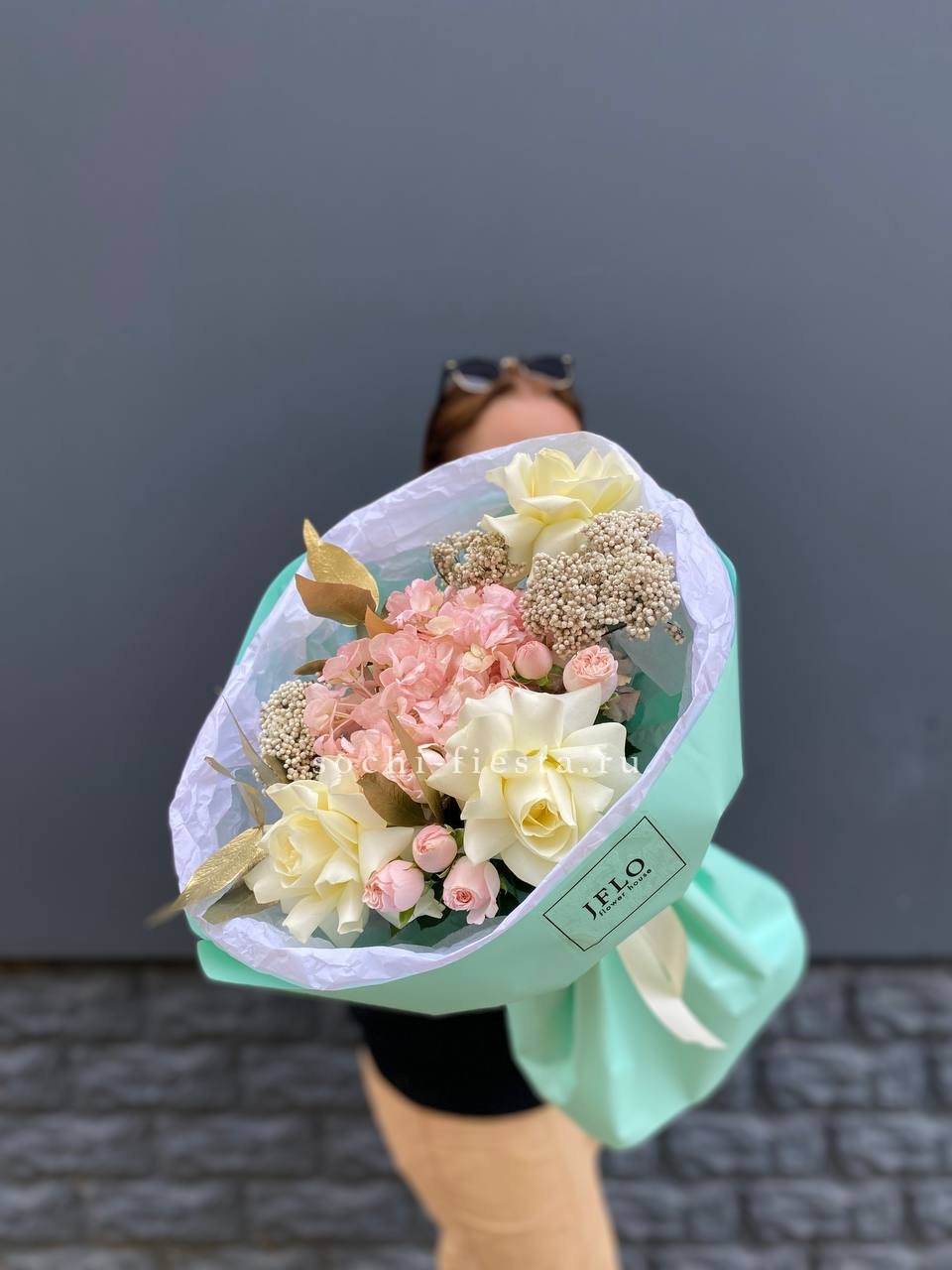 гортензия белая голландская, пионовидная роза Мисти Бабблс, оформление.