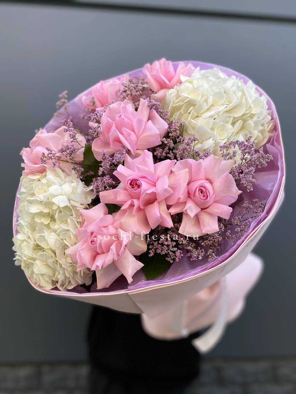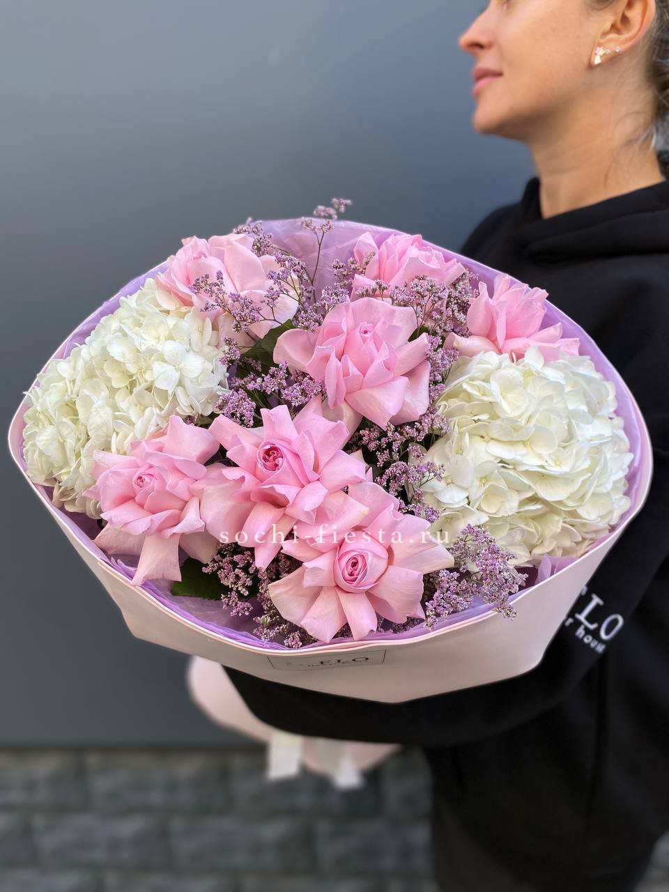 гортензия белая, роза одноголовая, роза кустовая, пионовидная роза Мисти Баблс, эустома тишью, упаковка, лента.