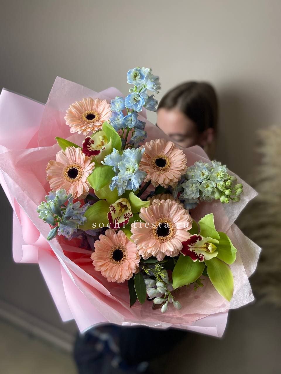гербера, орхидея цимбидиум (или эквивалент), дельфиниум,  эвкалипт,  лента, дизайнерская упаковка.