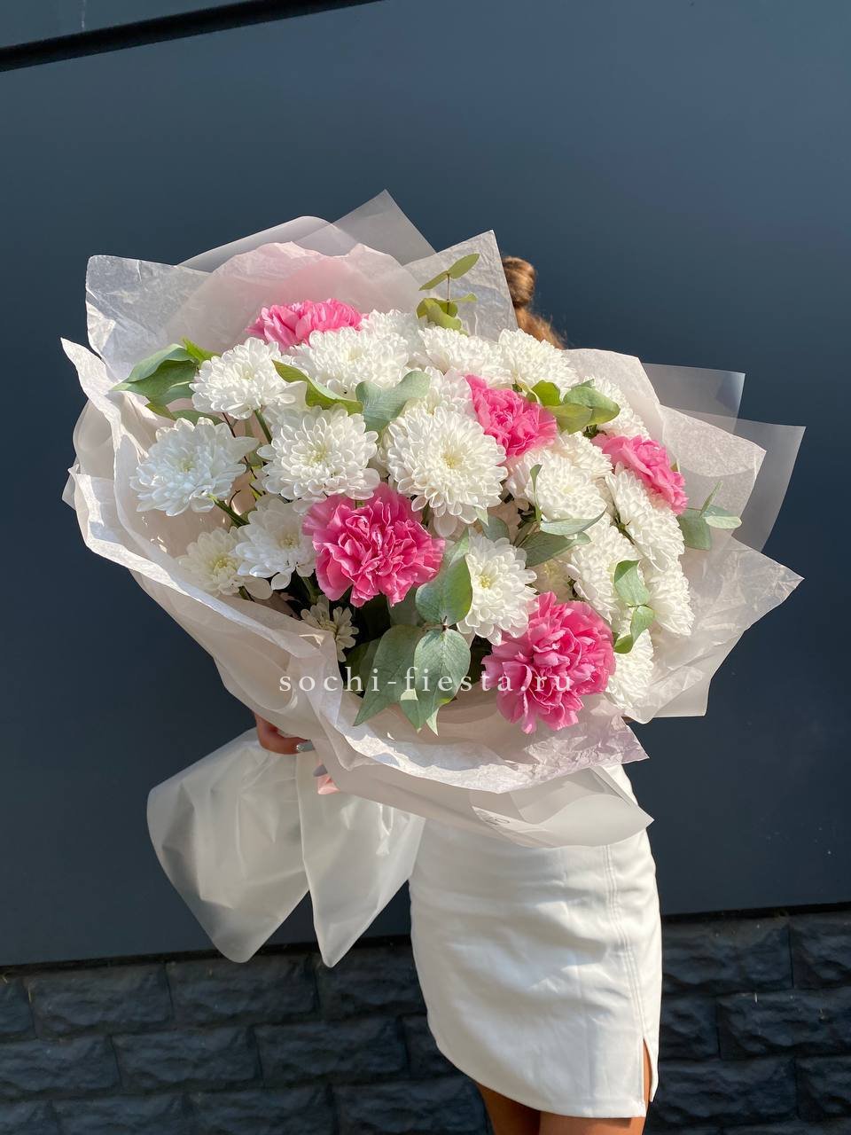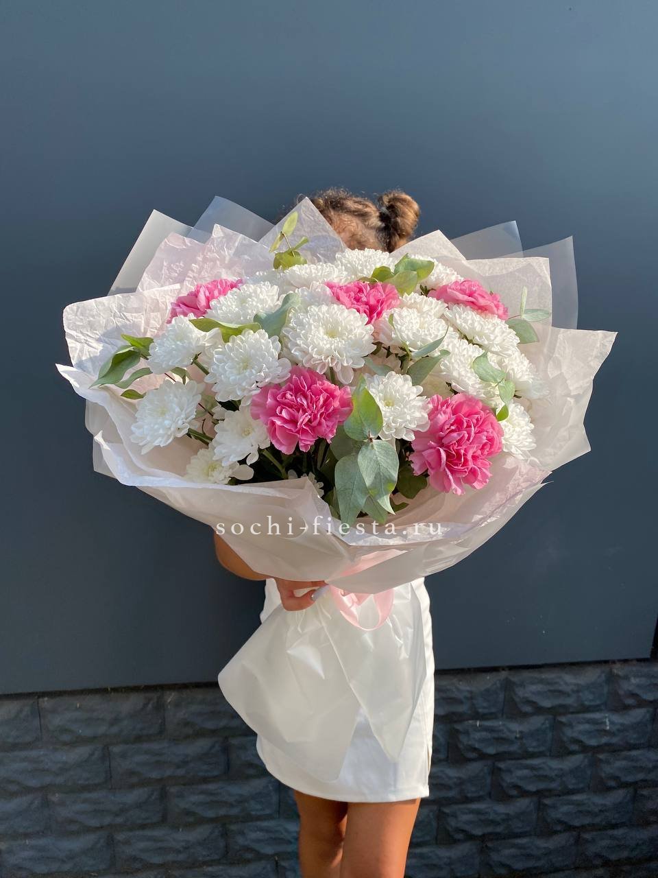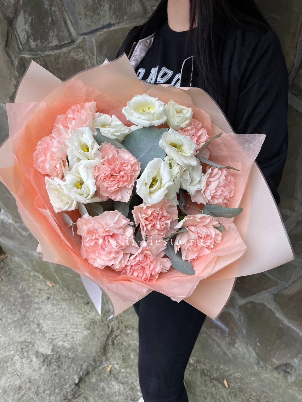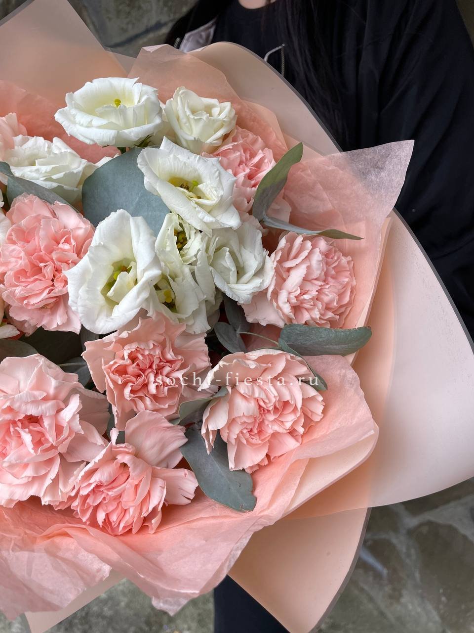диантусы, розовые розы, белые розы, эвкалипт, лента, крафт или дизайнерская пленка.