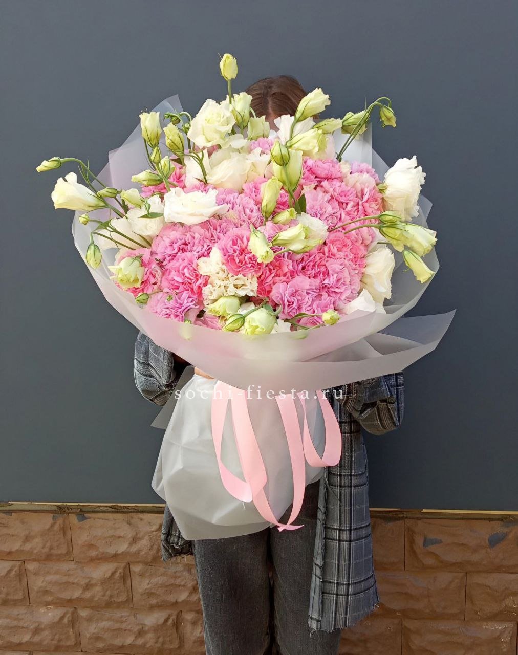 Махровые головки диантусов и многолепестковые бутоны эустом образуют плотную фактурную композицию. Каждый цветок раскрыт и виден, создавая ощущение густоты и насыщенности.