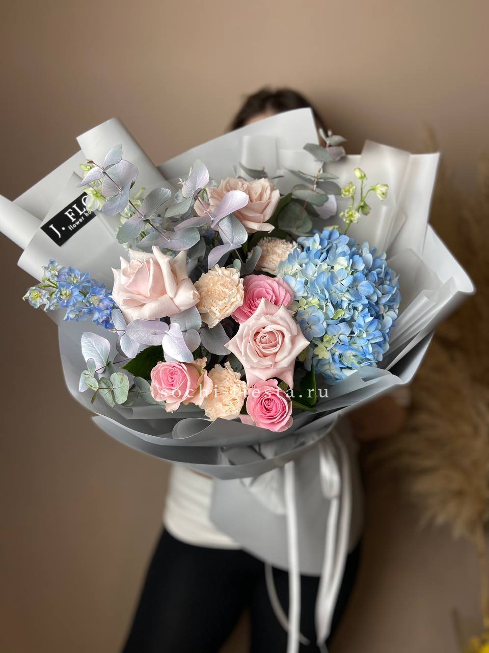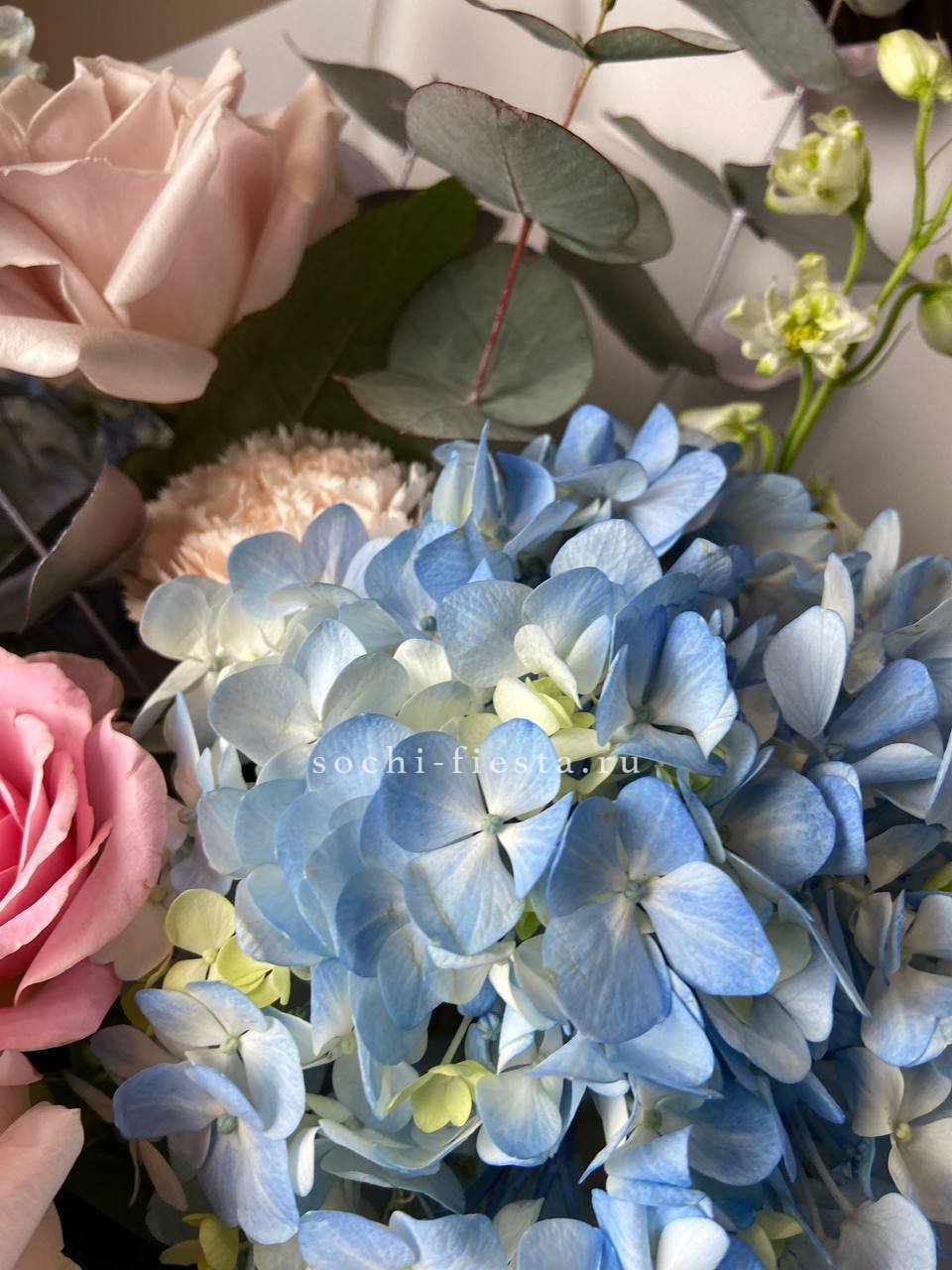 гортензия, хризантема, роза, эустома, упаковка, лента.