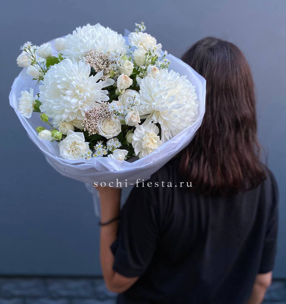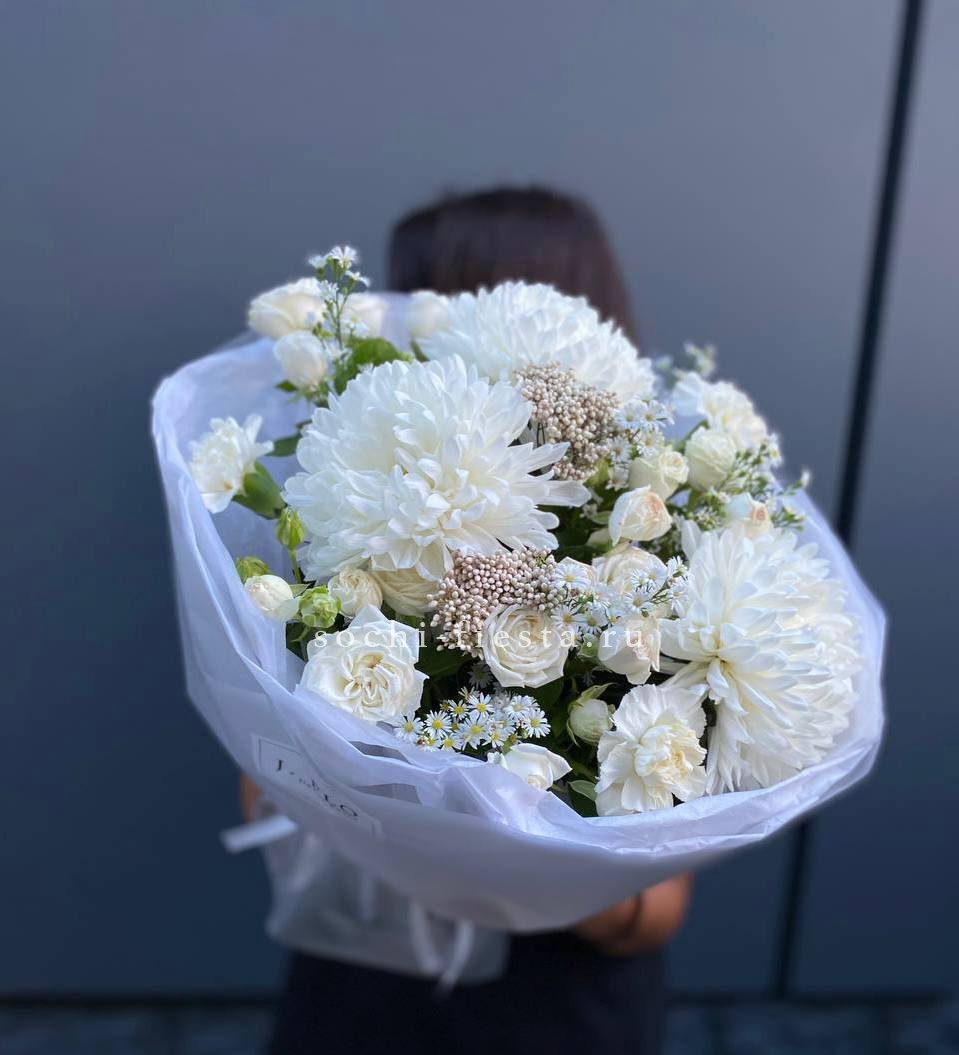 гортензия, хризантема, хамелациум, гербера, мисти баблс, диантус, пленка.