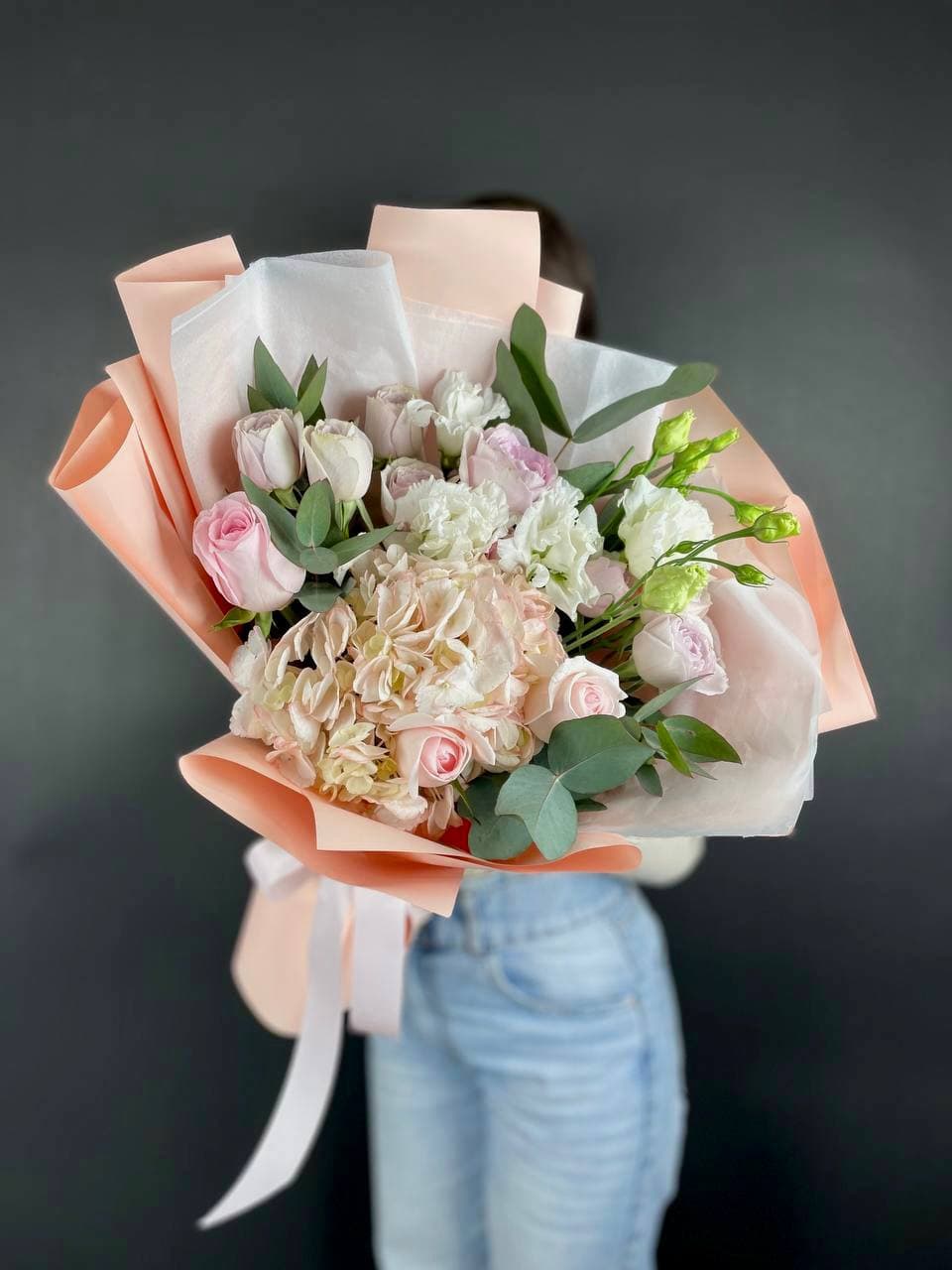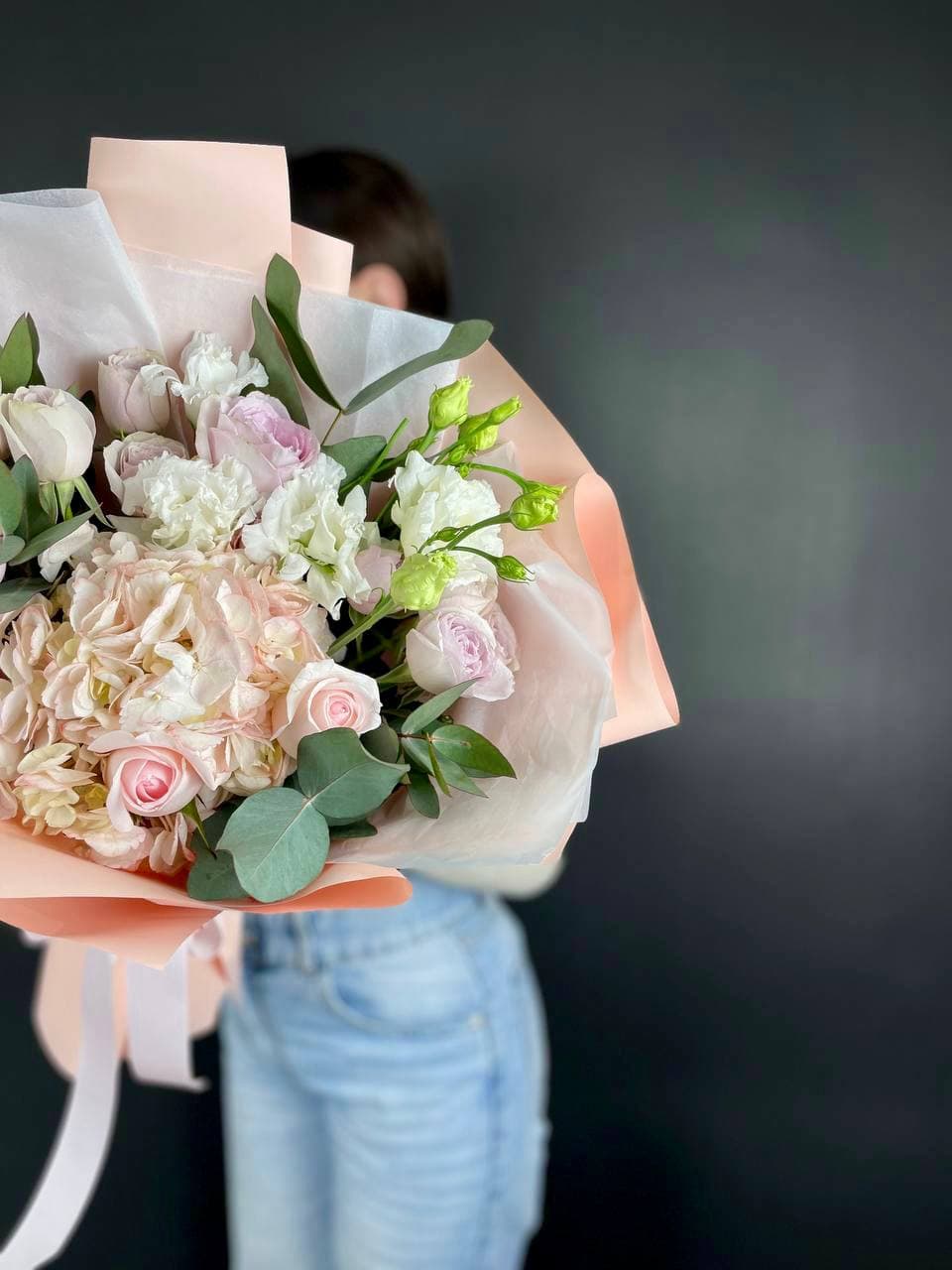 гортензия, белая роза, диантус, хризантема, эустома, озатамус, пленка.