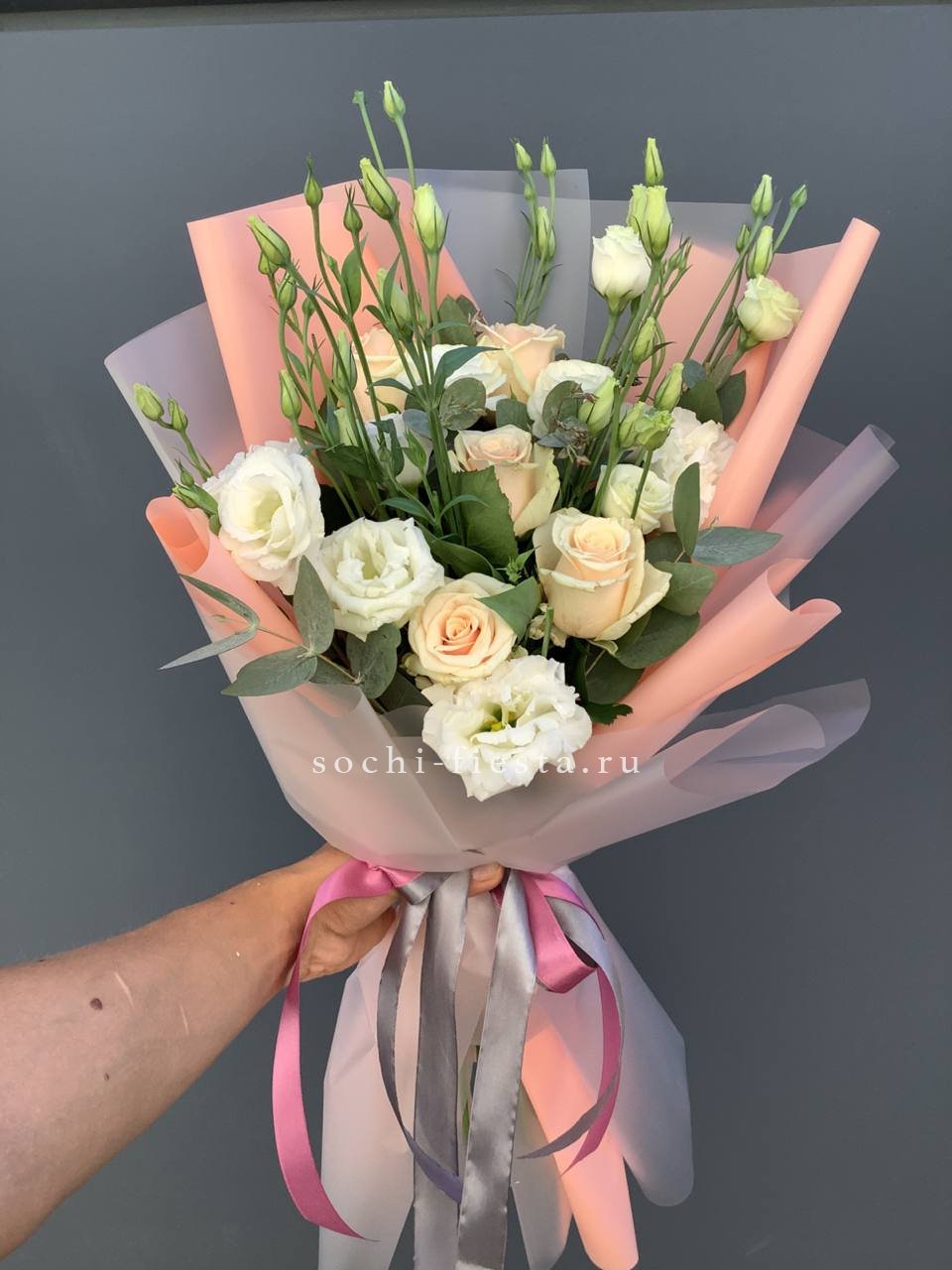 Сочетание роз и эустомы в светлой гамме с акцентом на естественность линий. Эвкалипт придает композиции свежесть и легкость. Дизайнерская упаковка завершает образ без лишних деталей.