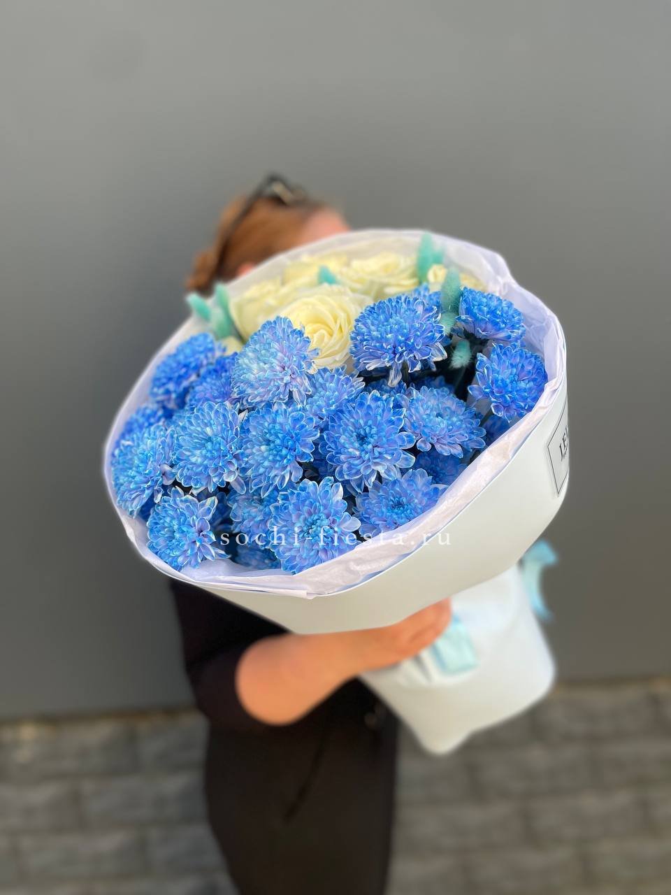 хризантема Бигуди, эвкалипт, дельфиниум, лента, дизайнерская упаковка.
