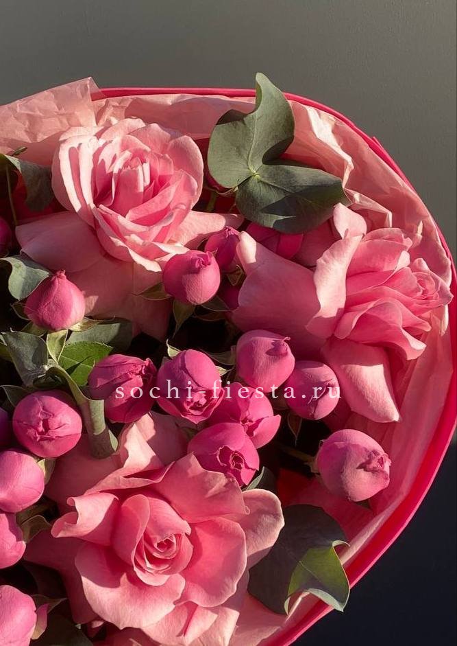 Мягкие пионовидные формы переплетаются с классическими розовыми бутонами в плотной округлой композиции. Эвкалипт освежает палитру и придаёт букету завершённость.
