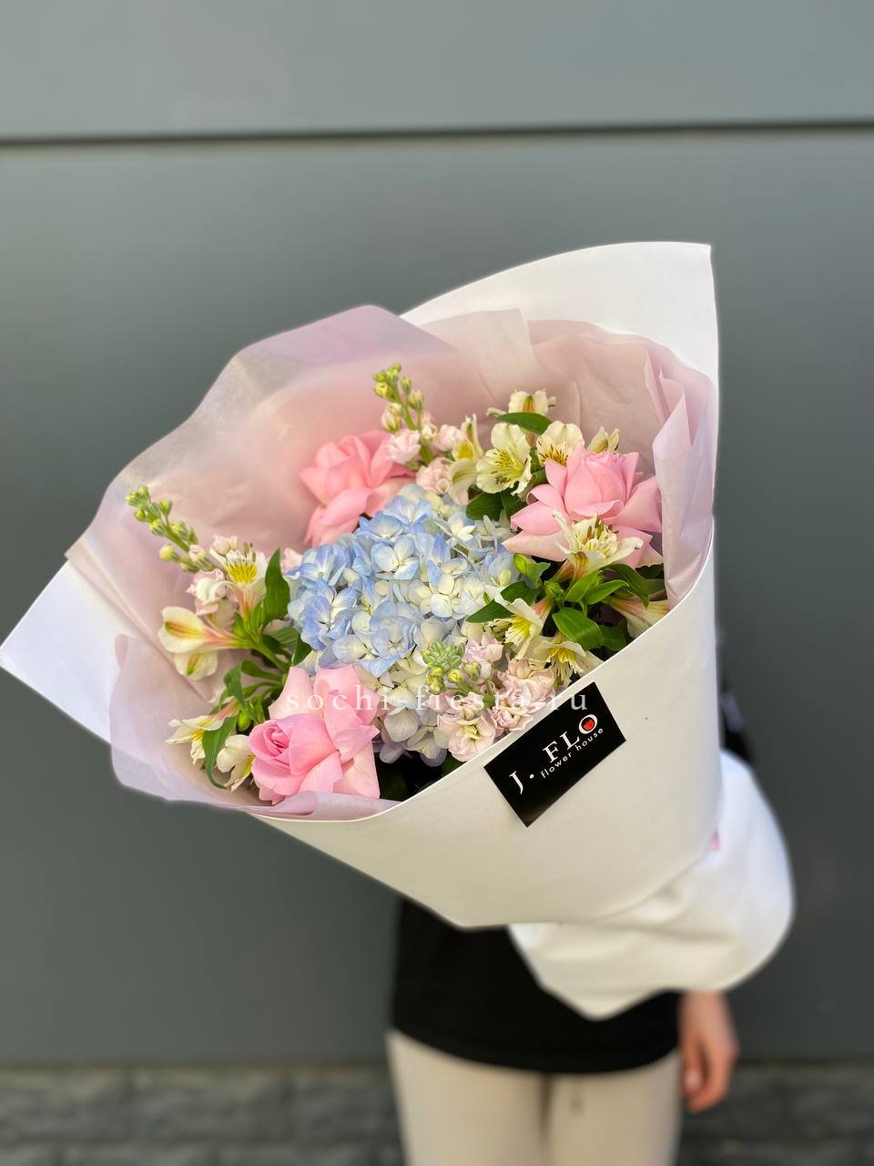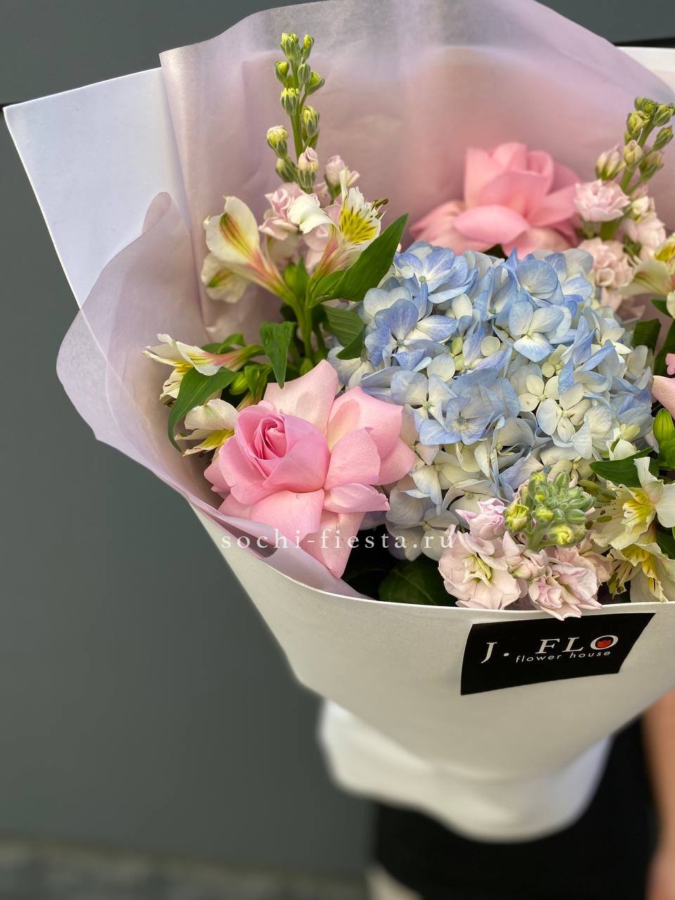 розы, гортензия, альстромерии, маттиола лента и дизайнерская пленка.
