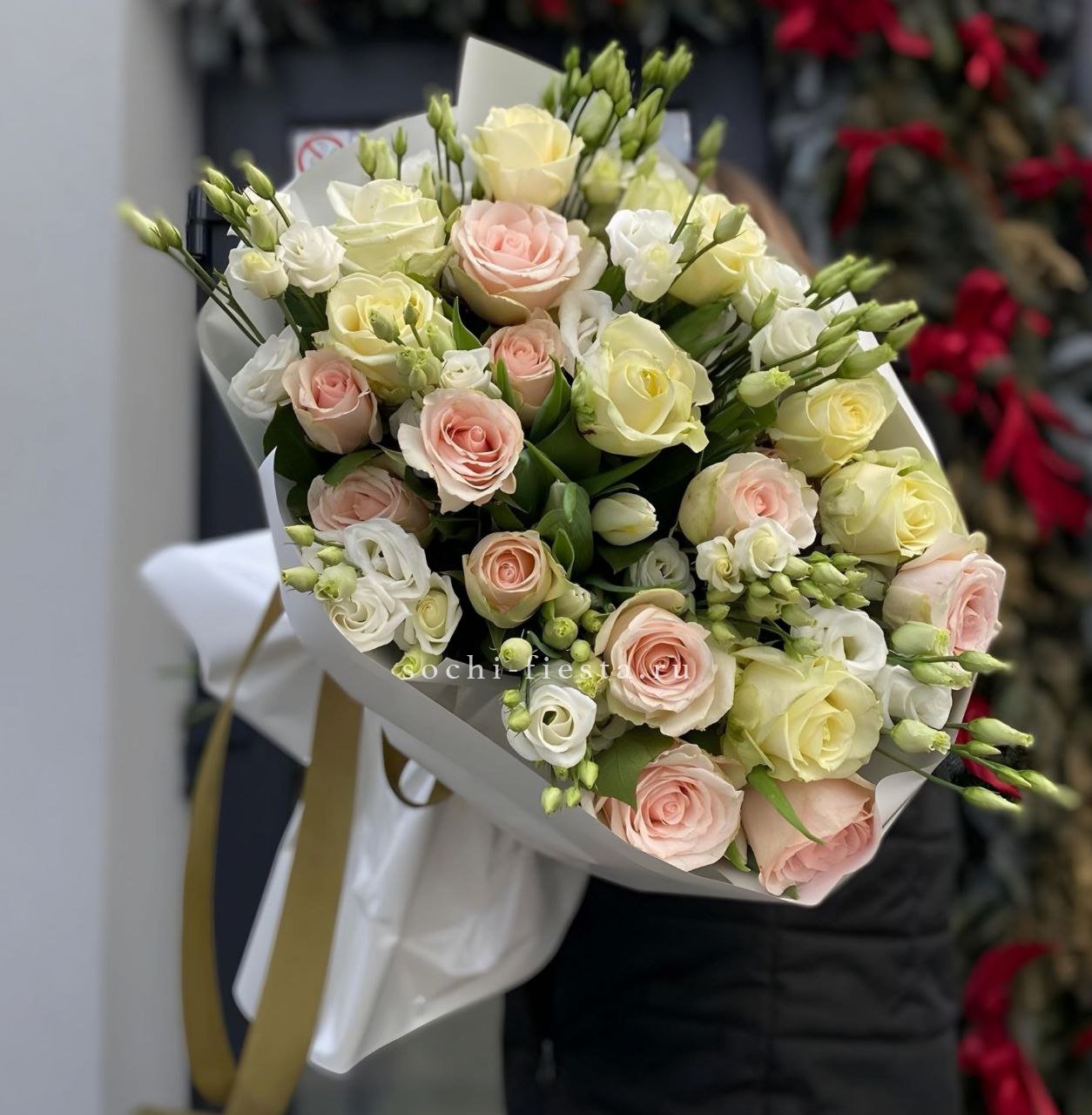 микс из роз, эустома, лента, дизайнерская упаковка.