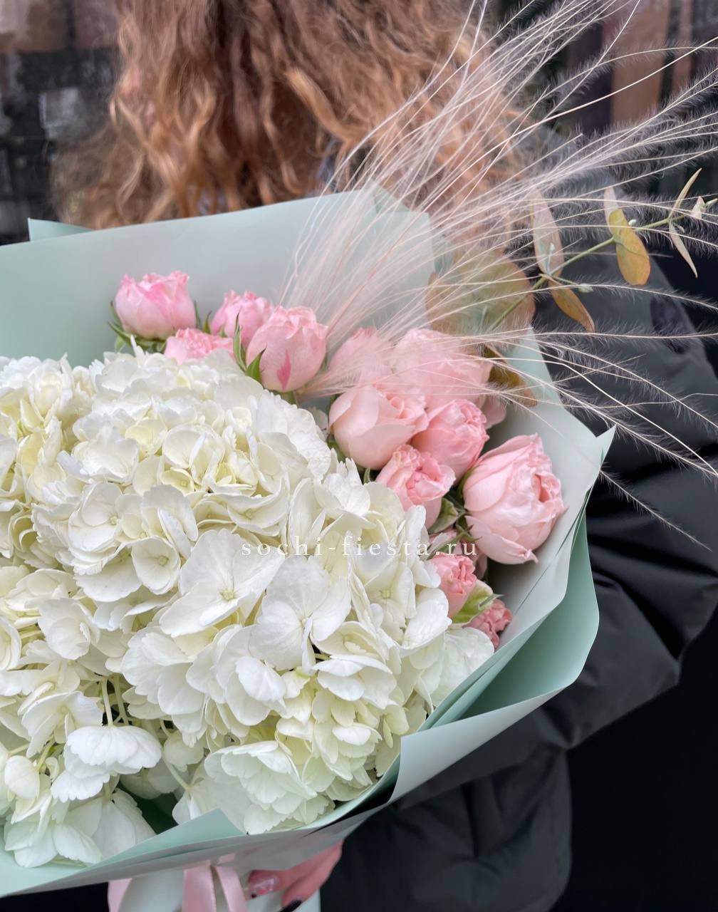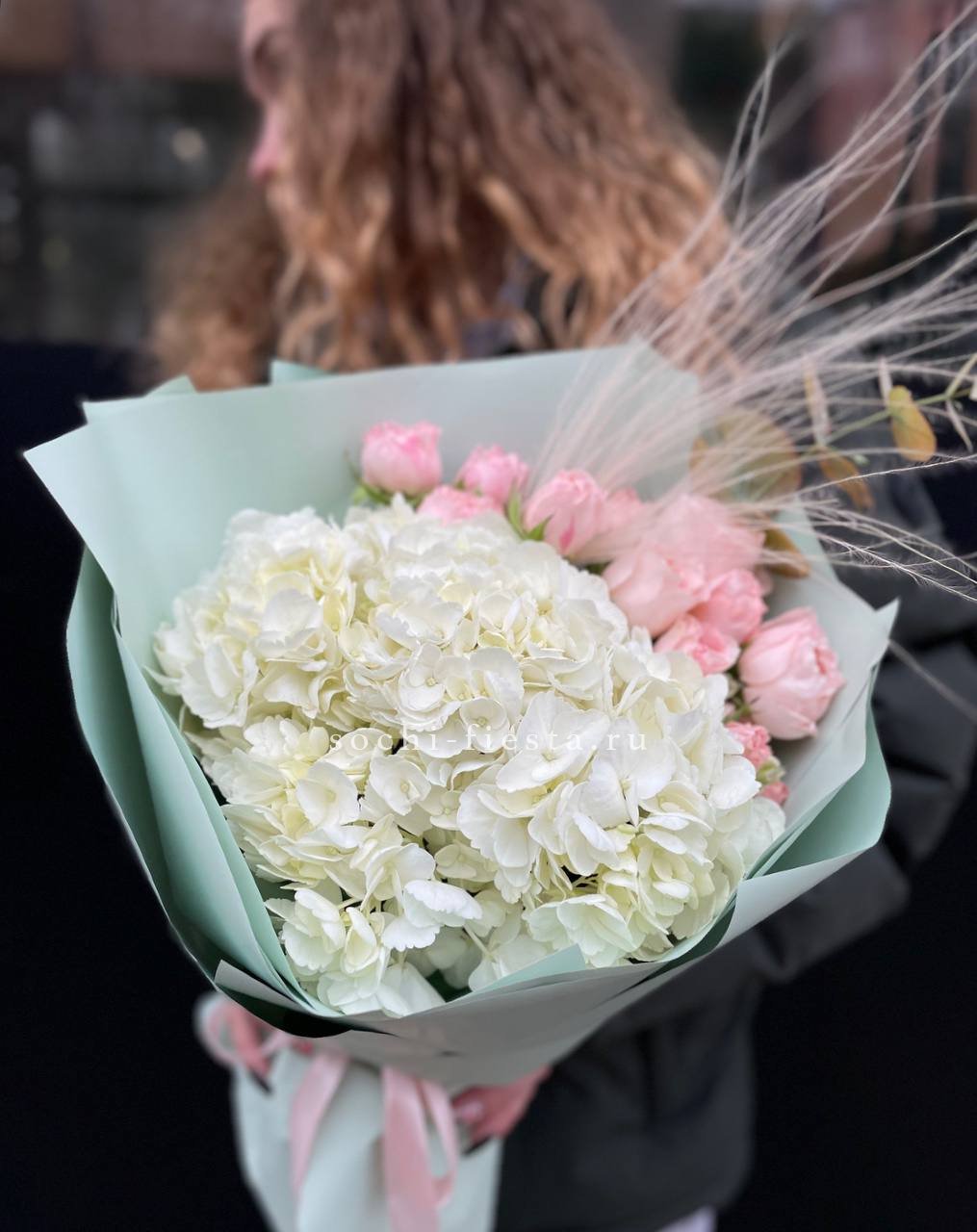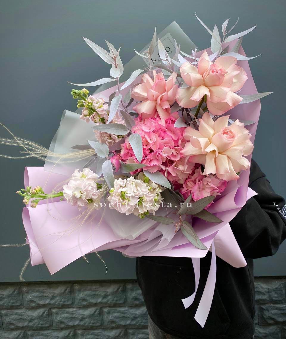гортензия, розы, диантусы, хризантема, пионы (или пионовидные розы), эустома, корзина. Состав может меняться, в зависимости от сезона.