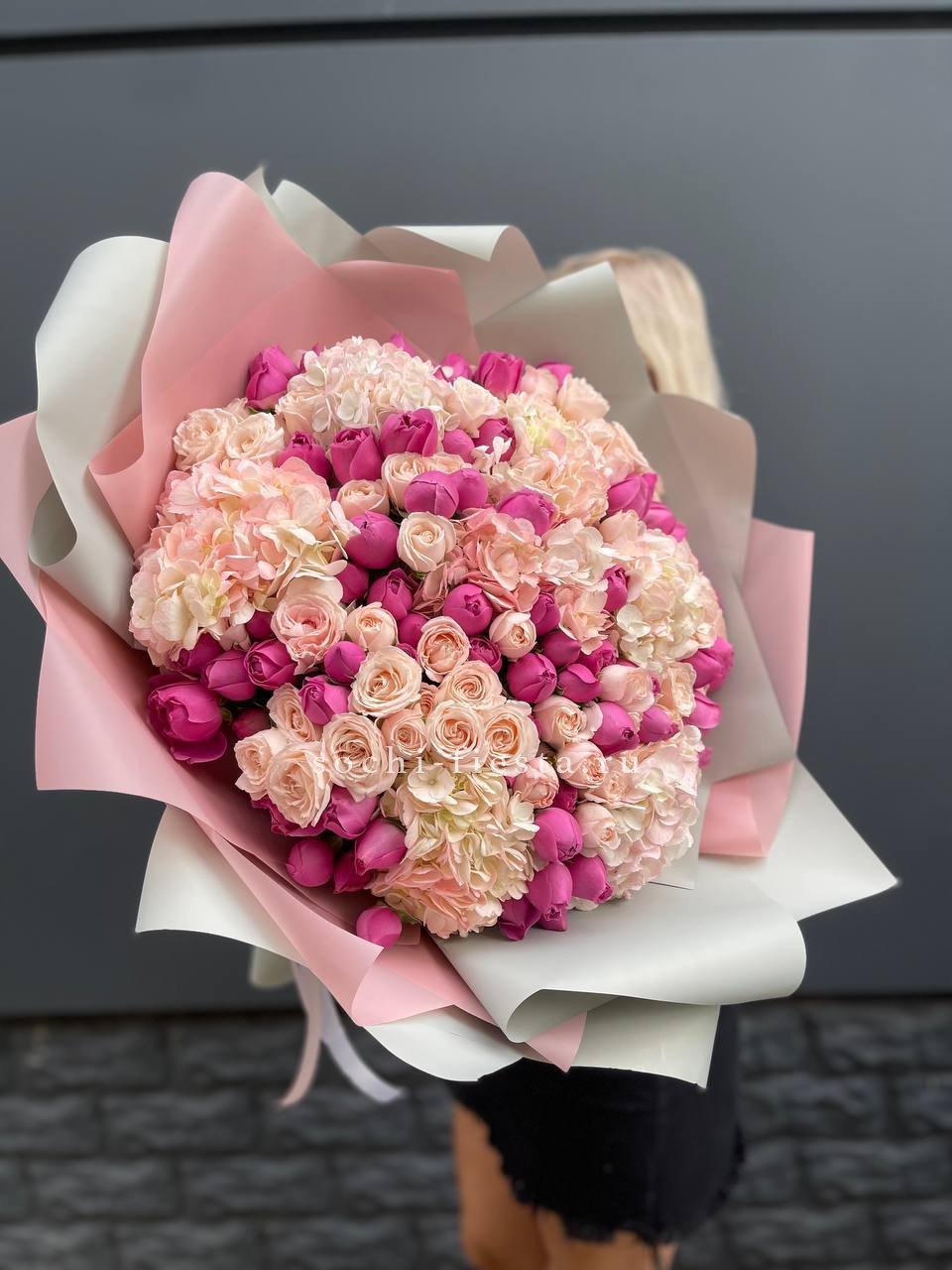 Пышная шапка из роз двух оттенков с объёмной гортензией и воздушным диантусом создаёт мягкий переход от белого к розовому. Бомбастик добавляет букету плотности, а эвкалипт освежает общую композицию. Универсальное решение для яркого поздравления.