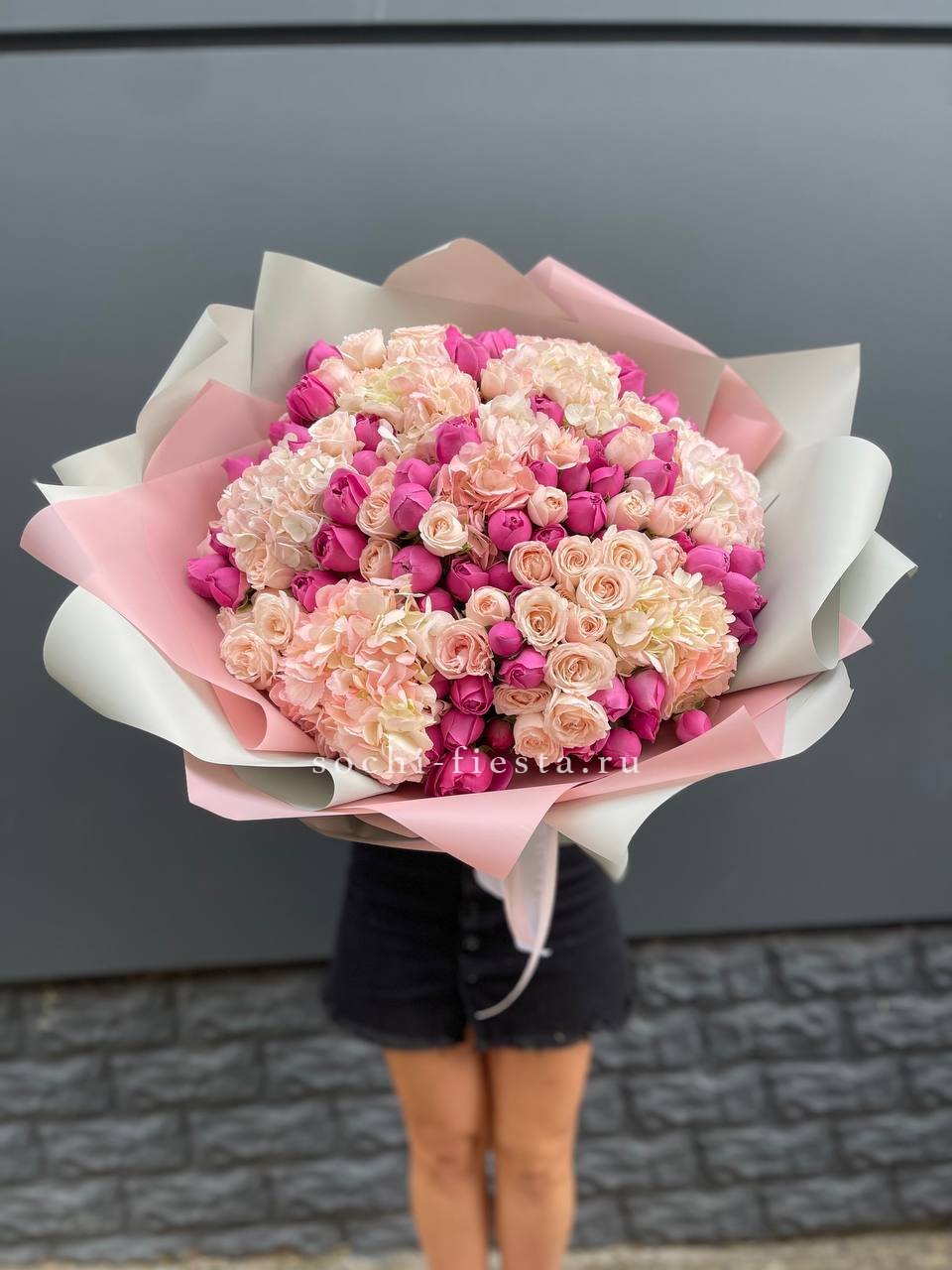 розовые розы, белые розы, диантус, бомбастик, гортензия, эвкалипт, пленка.