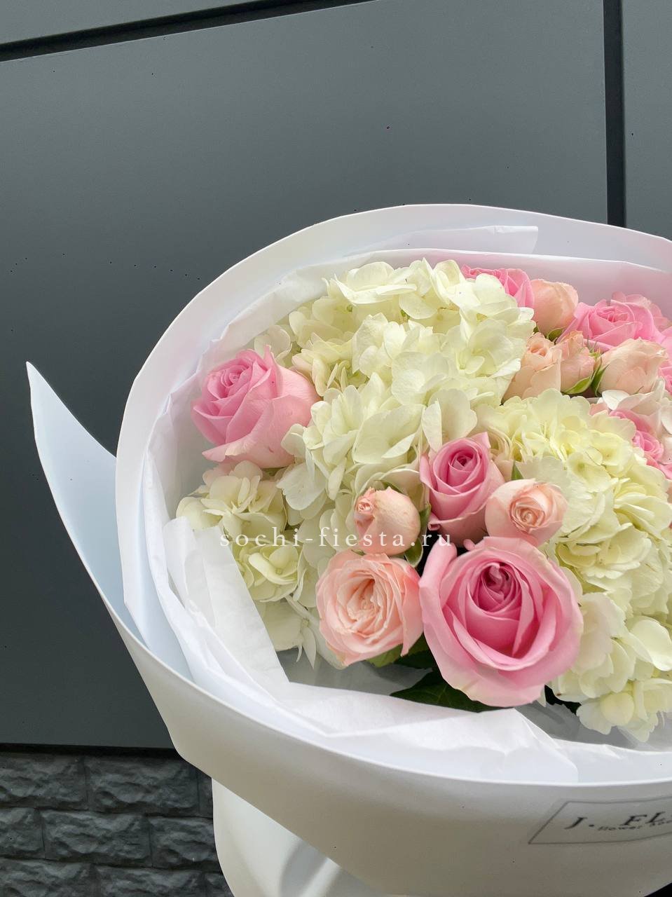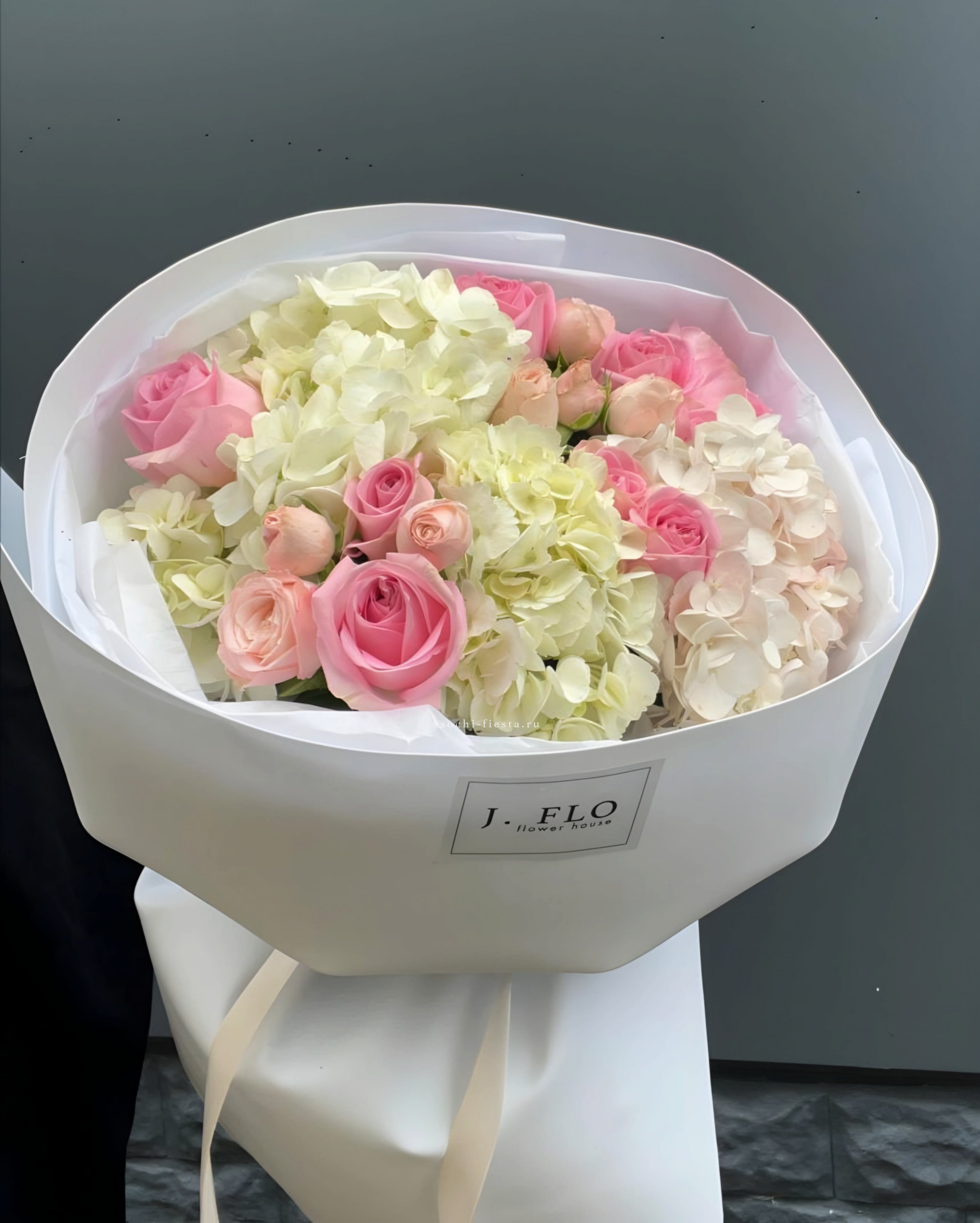 гортензия, гербера, диантус, эустома, свит ревиваль, кустовая роза, эвкалипт, лента, корейская пленка.