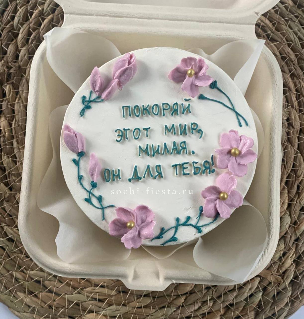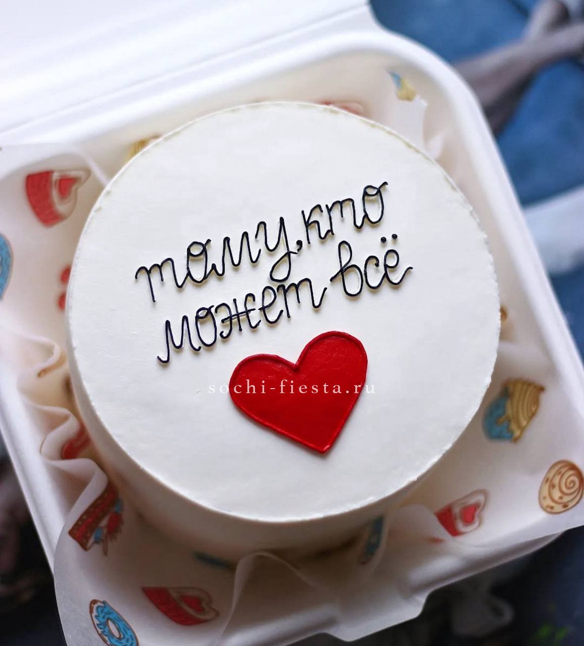 Компактный десерт с теплым посланием для близкого человека. Ручная работа видна в каждой детали крема и декора. Два вкуса начинки позволяют выбрать настроение этого дня.